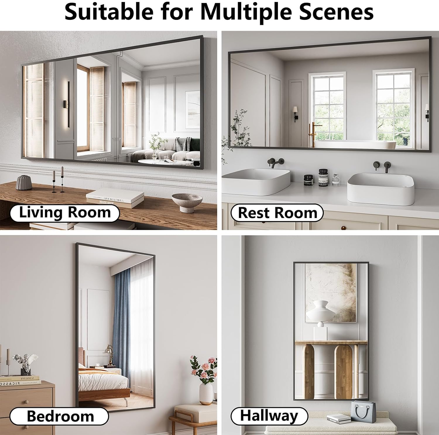 - More Than a Bathroom Mirror: Stylish Versatility for Every Room. Don’t stop at the bath—hang this mirror as a chic wall accent in entryways, living rooms, hotel suites, or walk-in closets. Its neutral black frame blends seamlessly with any decor, serving as both a functional outfit-check mirror and a light-enhancing focal point.