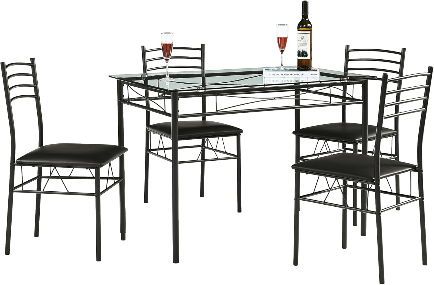 VECELO Kitchen Dining Table and Chairs Set for 4, Padded Seat & Glasses Tabletop, Space Saving, Matte Black