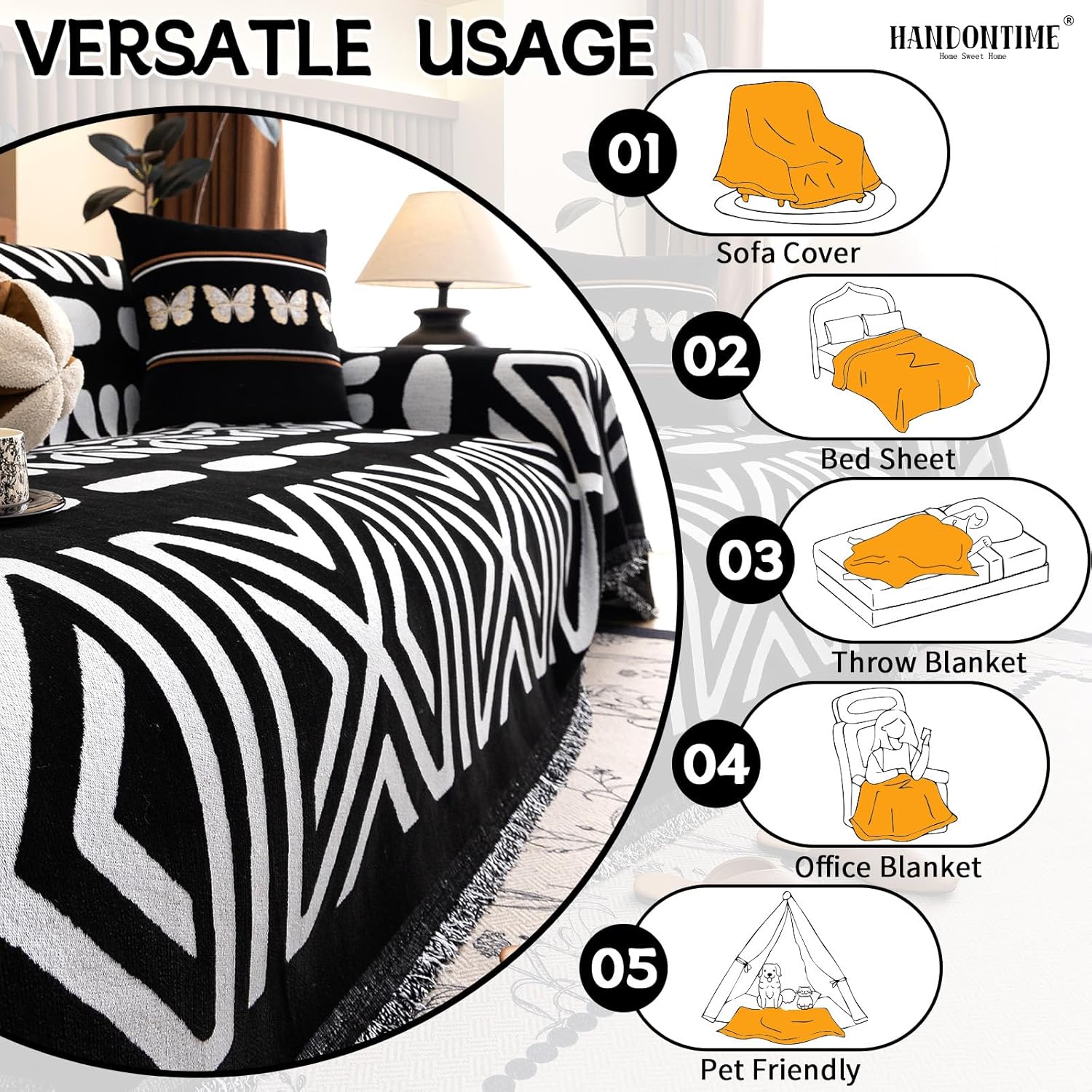 HANDONTIME Boho Couch Cover Blanket Geometric Striped Pet Covers for Couches and Sofas Black and White Dog Cover for Couch Pet Friendly Chenille Sectional Sofa Covers for Pets Washable, 71" X 150"