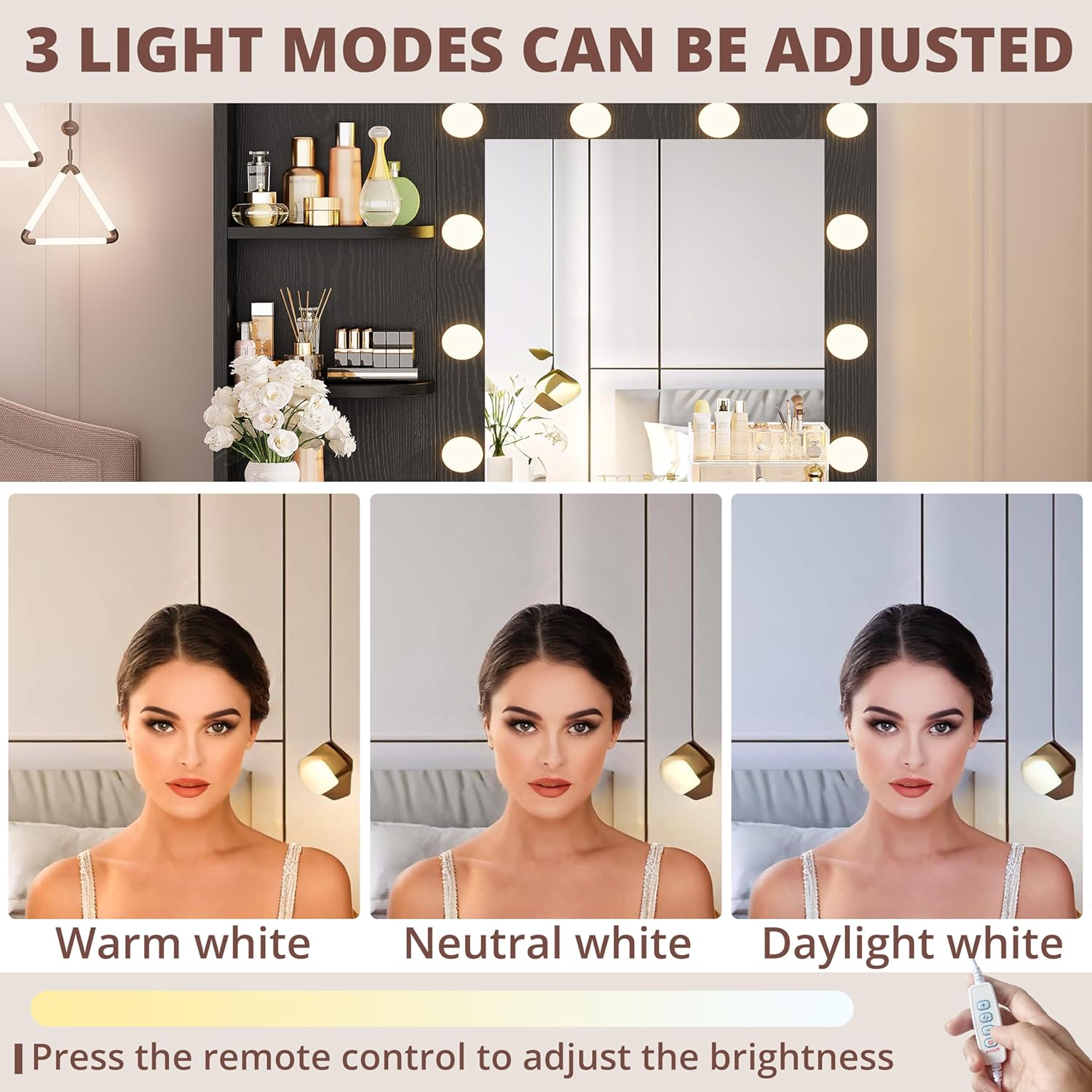 - 3 LIGHTING & BRIGHTNESS ADJUSTABLE: Comes with a mirror and 10 LED bulbs for the vanity desk. The brightness of the lights is adjustable with 3 colors to choose from: warm yellow, warm white and cool white, so that you can choose different light colors for different scenes and different make-up