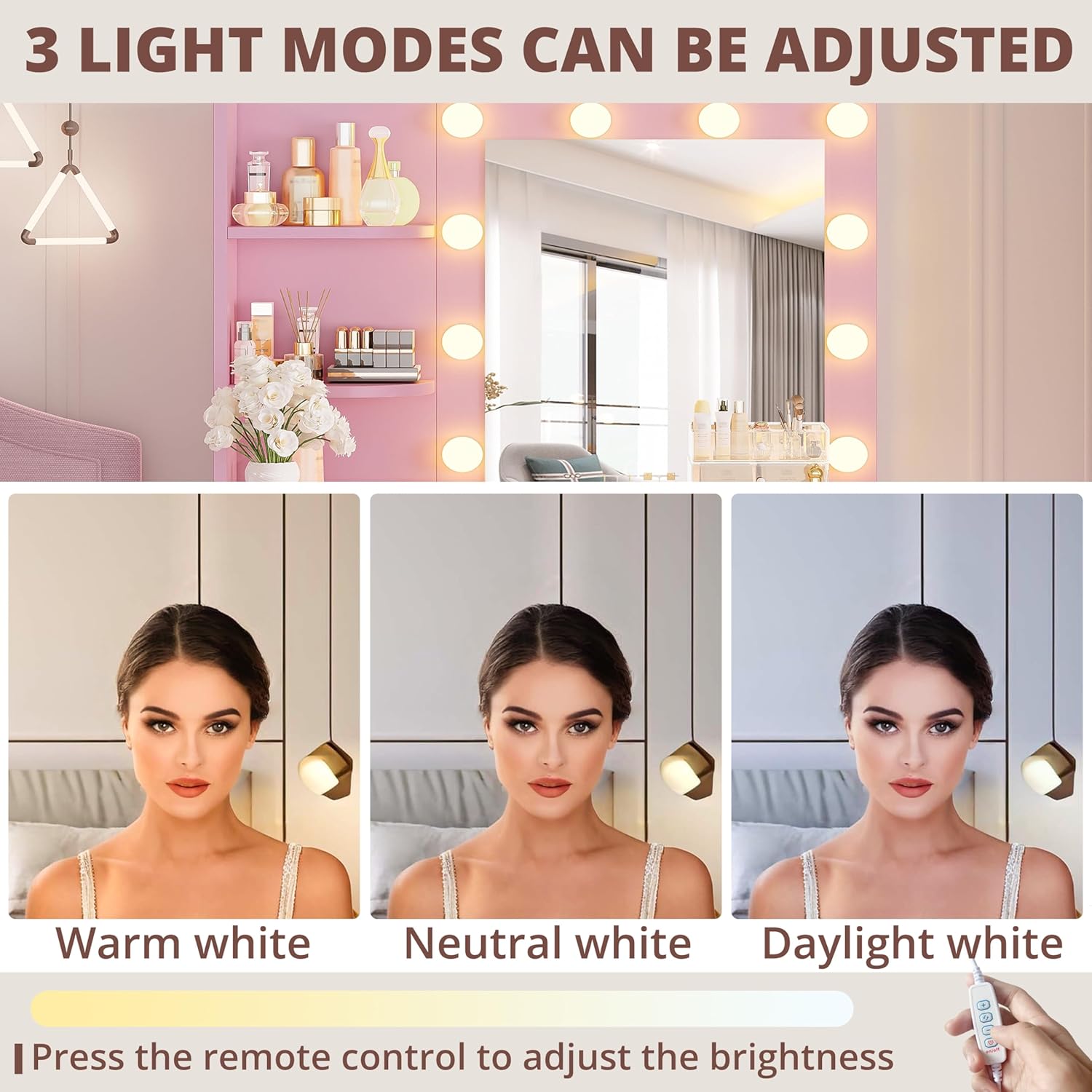 - 3 LIGHTING & BRIGHTNESS ADJUSTABLE: Comes with a mirror and 10 LED bulbs for the vanity desk. The brightness of the lights is adjustable with 3 colors to choose from: warm yellow, warm white and cool white, so that you can choose different light colors for different scenes and different make-up