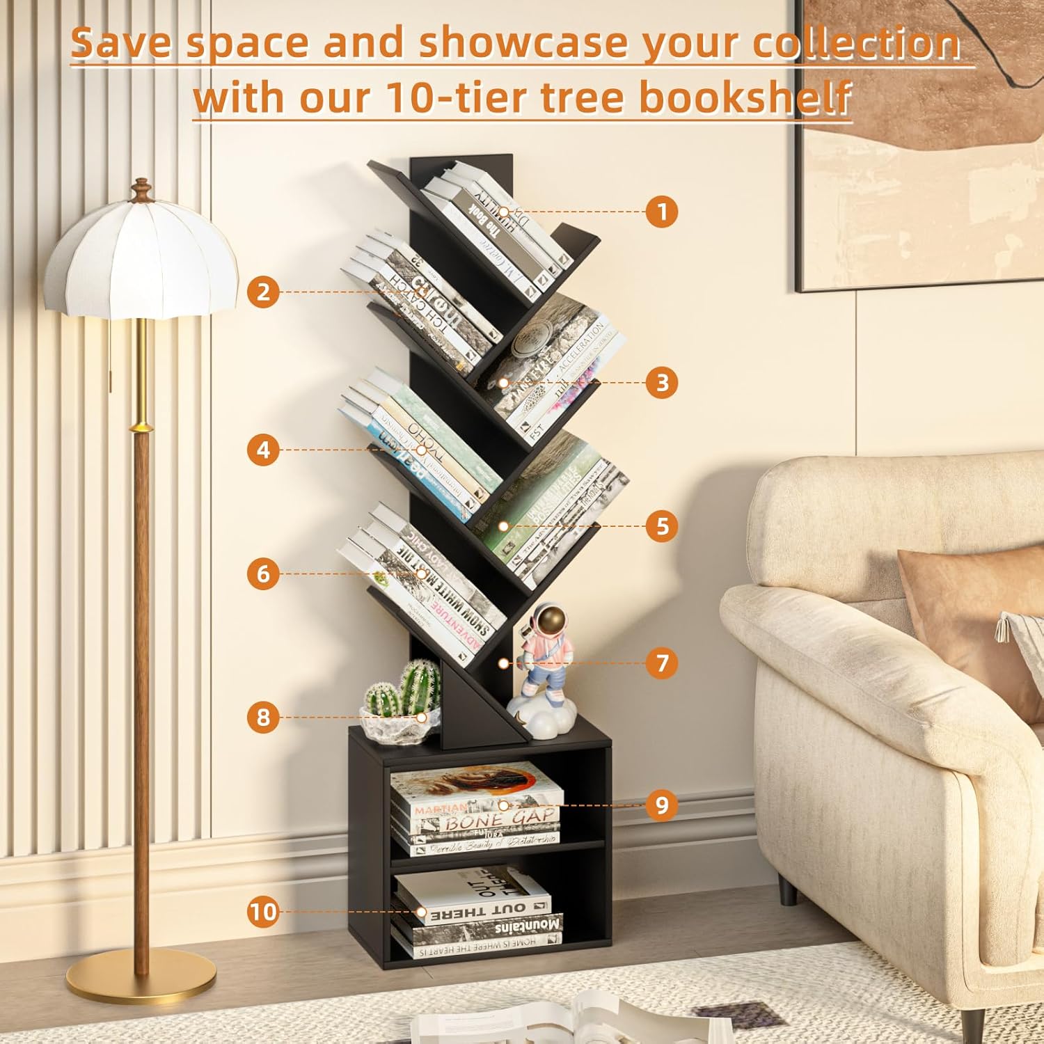 - [10-Layer tree bookshelf] The 10-layer design of this bookshelves provides you with more options for organizing your books. The vintage style and charming design of this tree-shaped book shelf make it a practical piece of furniture that also doubles as an attractive art piece in your home.