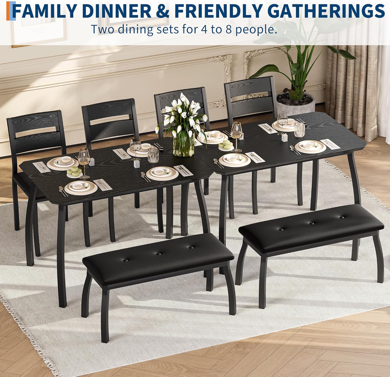 - Soft Seating for Relaxed Dining: PU leather-upholstered chairs and bench offer a comfortable seating, while the ergonomically curved backrests support your posture for leisurely meals. Each chair complements the dining table perfectly for cozy dining
