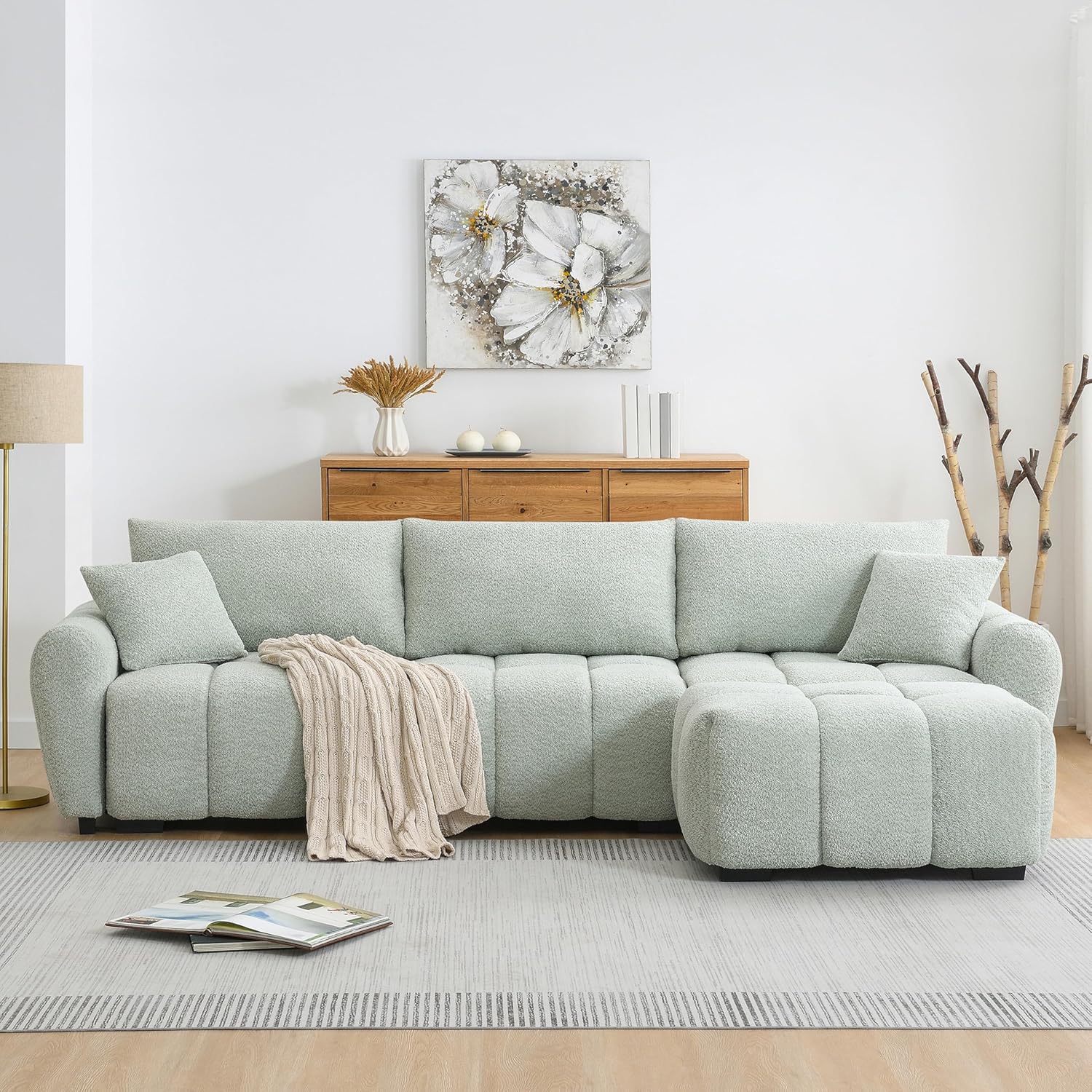 Ball & Cast Modular Sectional Sofa W/Movable Ottoman and 2 Lumbar Pillows,4 Seater L Shaped Couch W/Deep Seat&Pull-line Design,Boucle Fabric Upholstered Sofa for Living Room,Apartment,Light Green,110"