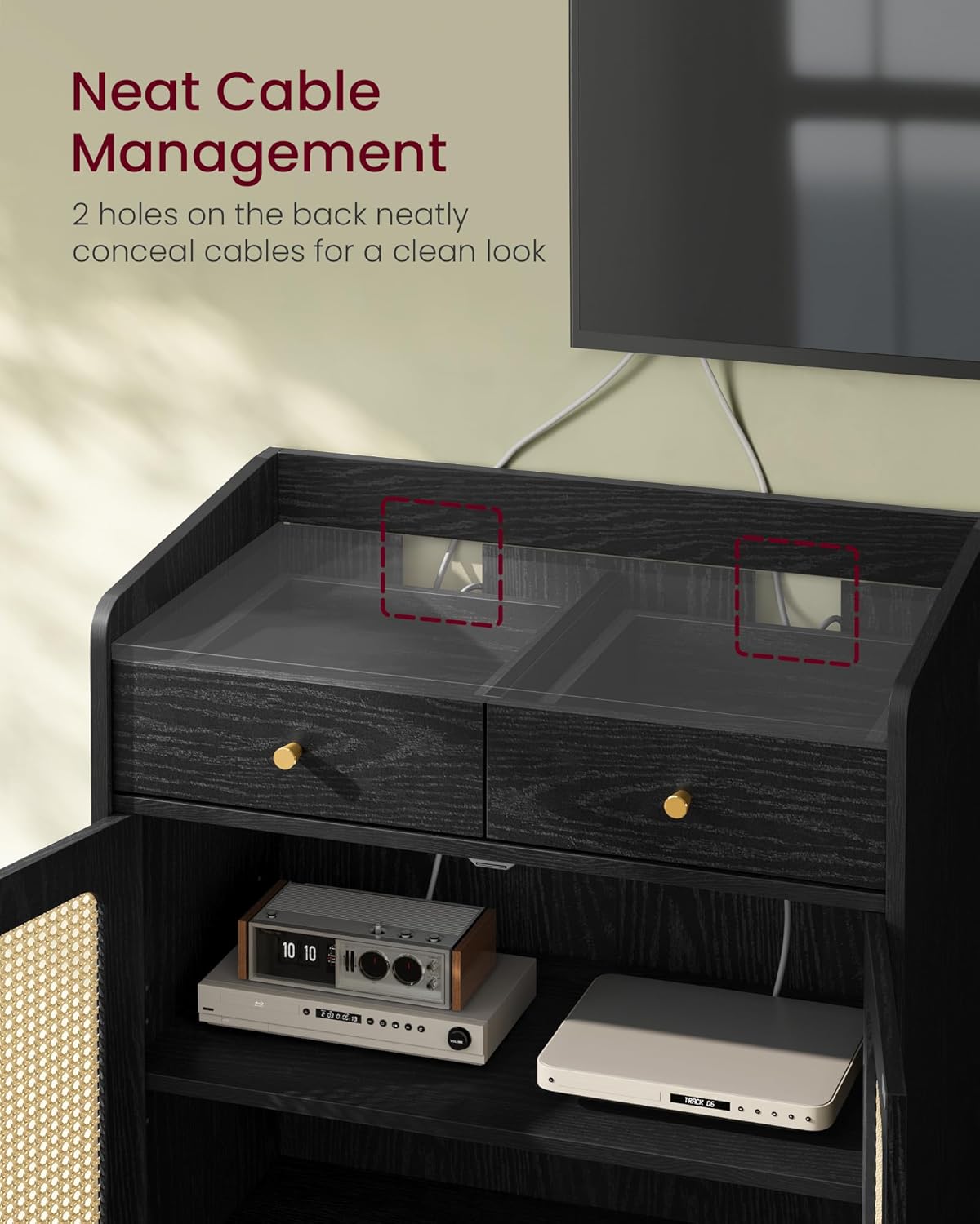 - 【CUSTOMIZABLE STORAGE, TIDY CABLES】Behind the doors, an adjustable shelf accommodates dinnerware and serving essentials of varying sizes. 2 thoughtfully placed cable holes allow for efficient cable management, maintaining a clean look in your space