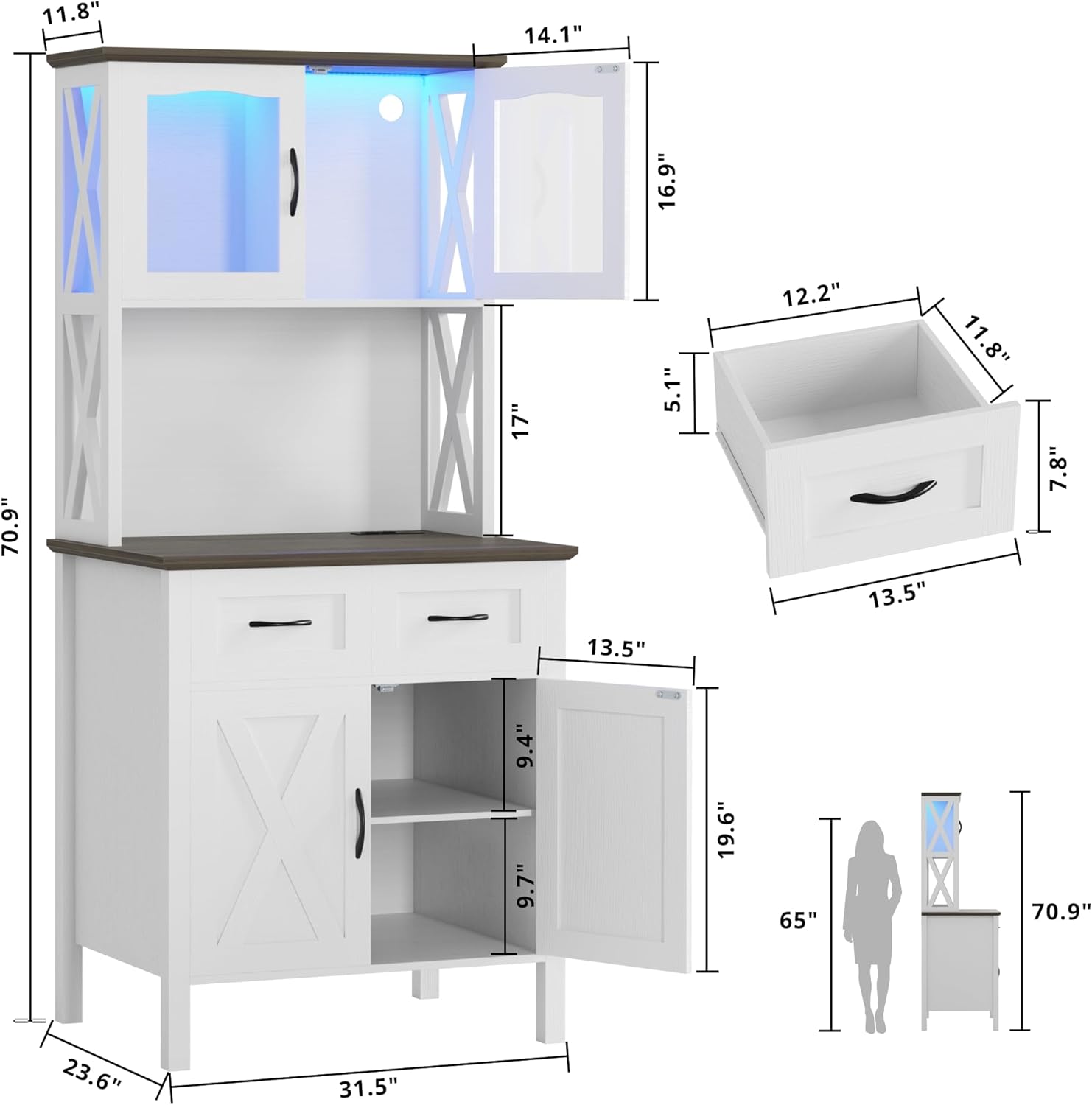 - Extra Large Storage Space: The kitchen pantry cabinet combines LED lights, electrical outlets, glass cabinet doors, 2 spacious drawers, 2 tiers of storage shelves and open countertop. Perfect for storing items of all sizes and keeping them organized