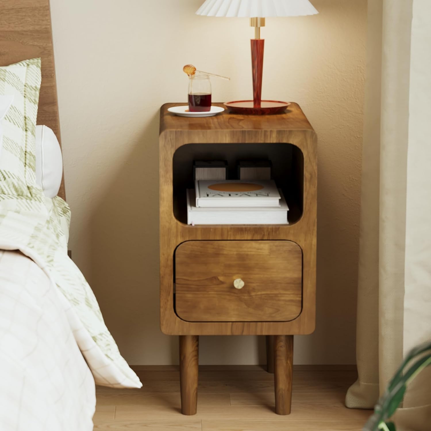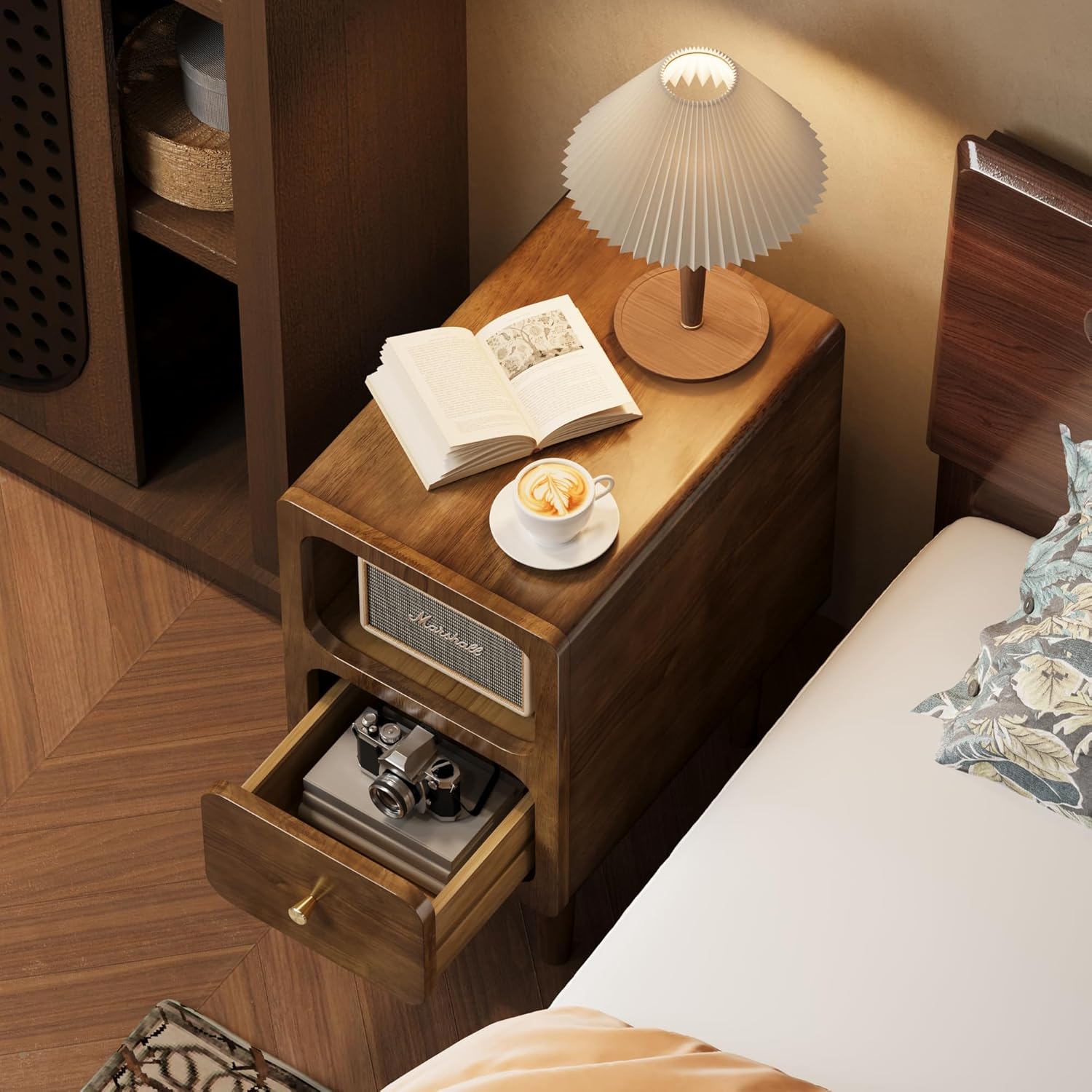 Narrow Nightstand, Solid Wood Night Stand with Drawers, Walnut Mid Century Modern Nightstand, Small Beside Table with Open Storage Shelf for Bedroom (12 inch)