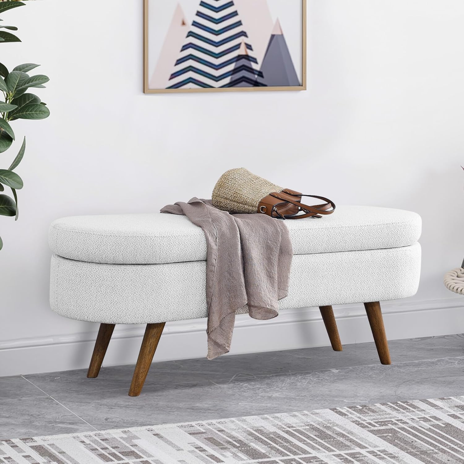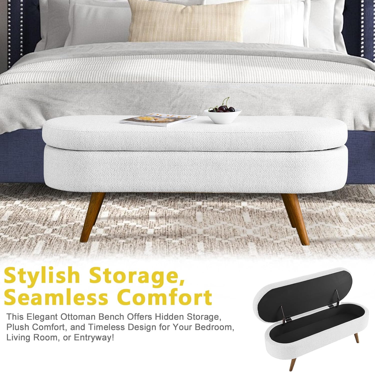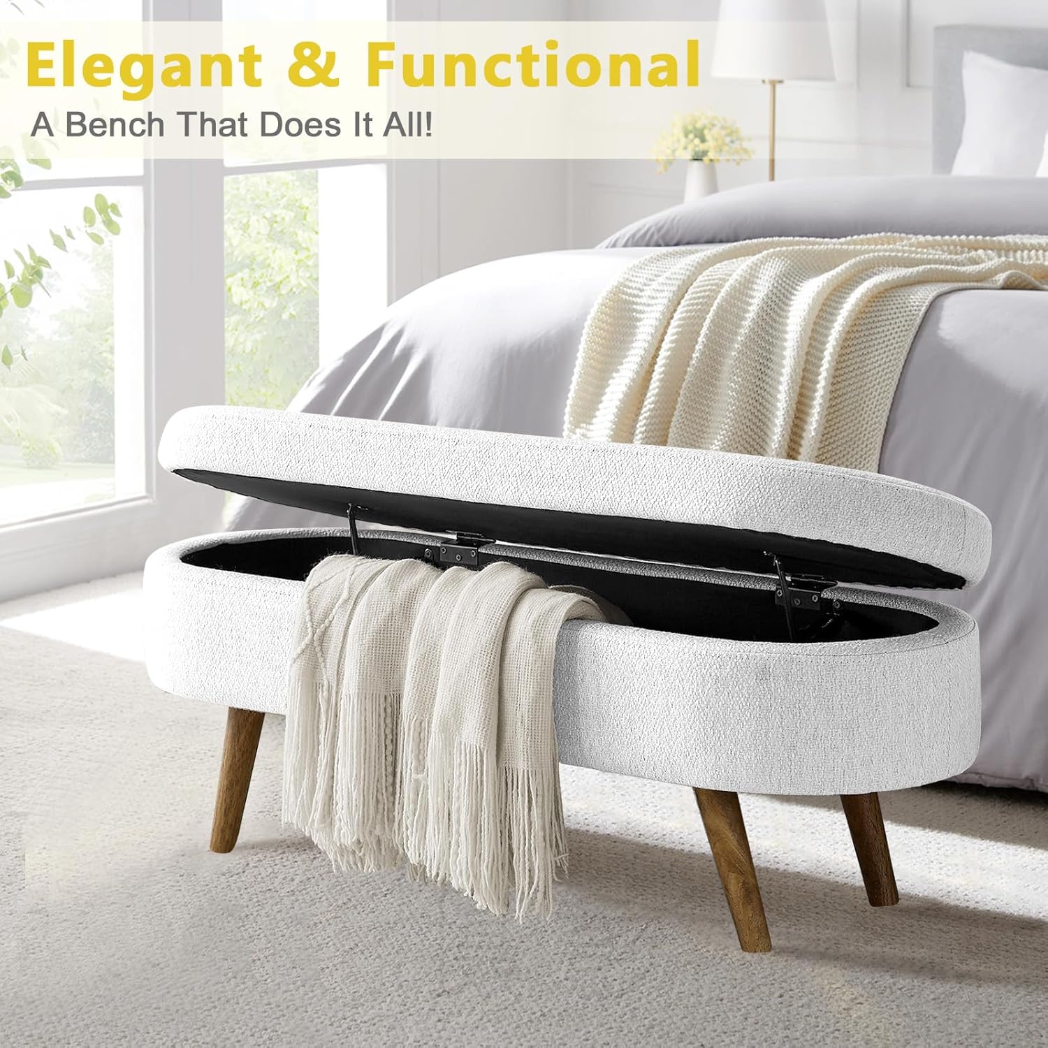 - [Versatile Design for Any Space] Use this bench for bedroom end of bed, as a storage ottoman, or entryway bench. Its oval silhouette and neutral beige tone add warmth and sophistication to small spaces or larger rooms alike.