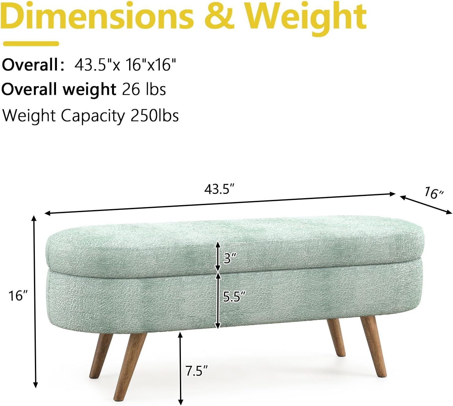 - [Spacious Storage Bench for Bedroom] Measuring 43.5"L x 16"W x 16"H, this ottoman bench offers ample hidden storage to keep your bedroom, entryway, or living room clutter-free. Perfect as an end of bed storage bench for organizing pillows, blankets, or seasonal clothes.