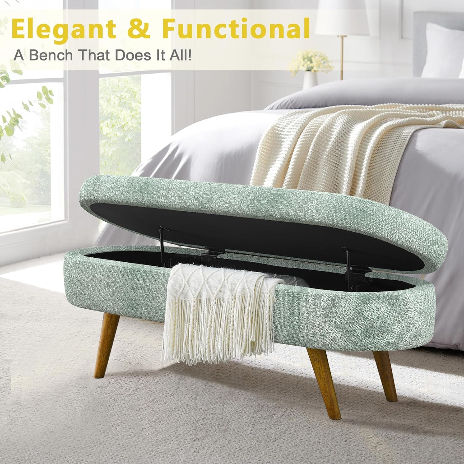 - [Versatile Design for Any Space] Use this bench for bedroom end of bed, as a storage ottoman, or entryway bench. Its oval silhouette and neutral beige tone add warmth and sophistication to small spaces or larger rooms alike.