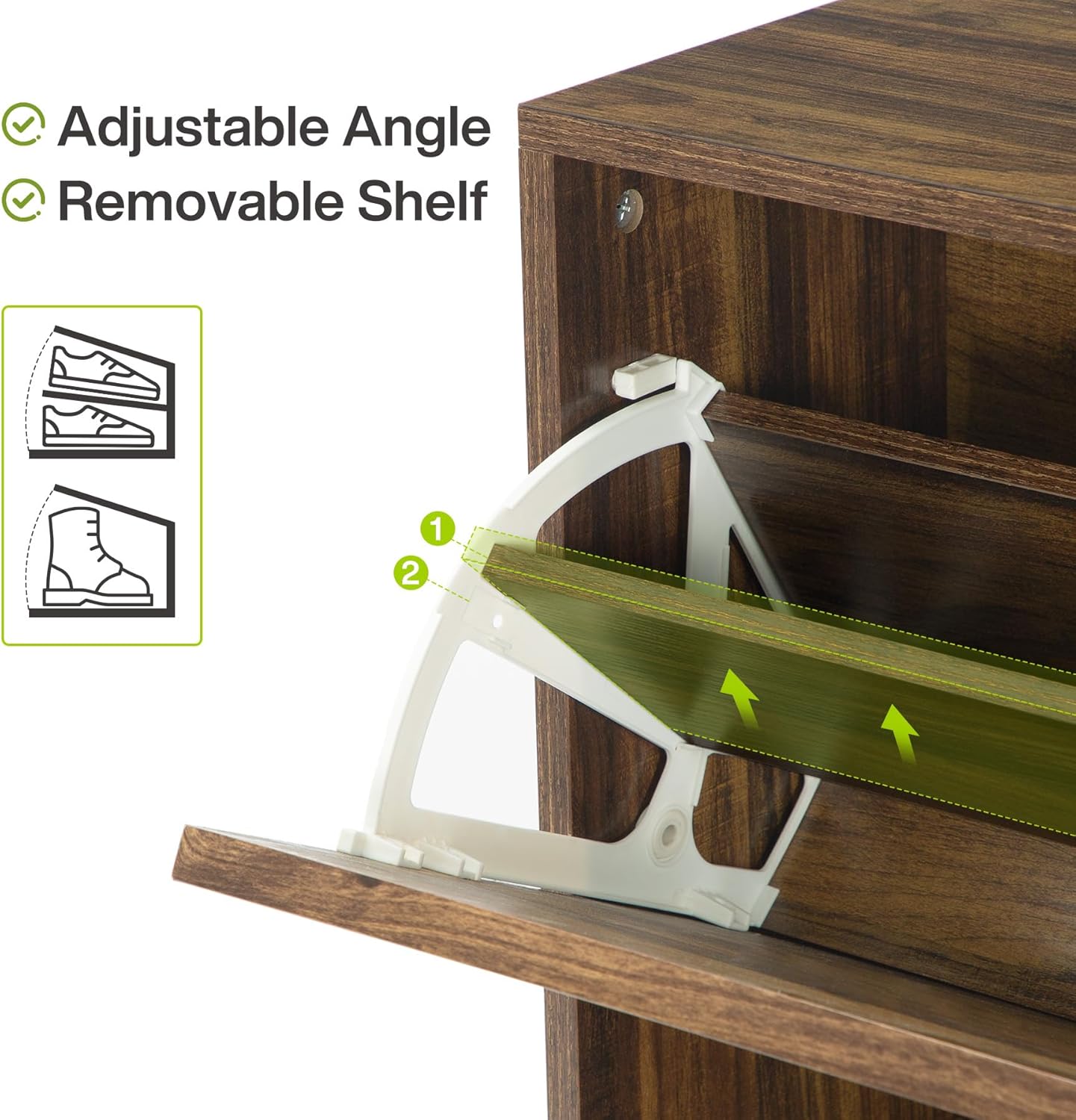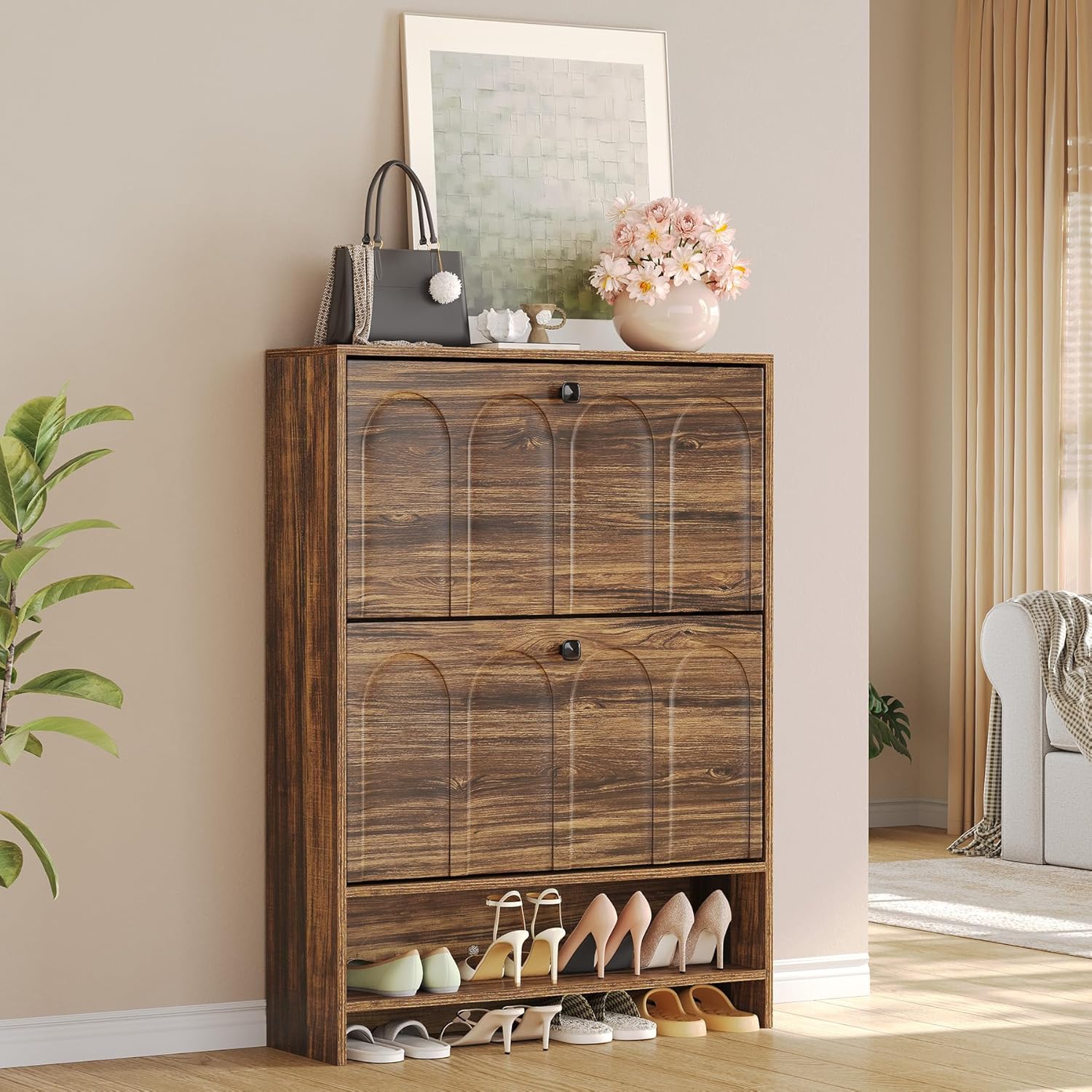 - Modern + Versatile Style: This shoe cabinet is beautiful. The matte walnut brown finish blends perfectly with any home decor, adding a touch of warmth and modernity that radiates in any corner of your home