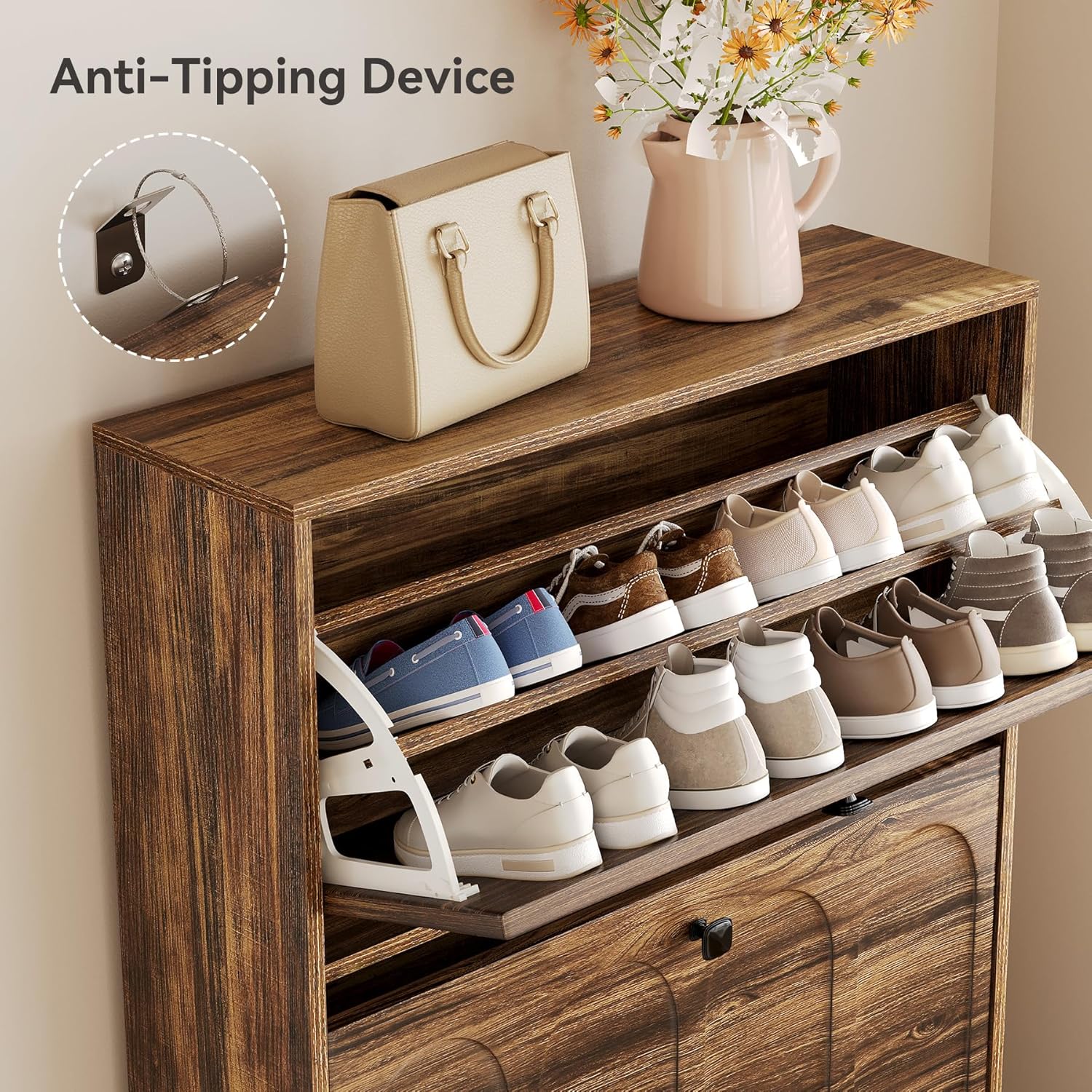 - Robust MDF + Anti-Tip Safety: This shoe cabinet is made from high-quality MDF, ensuring sturdiness for long-term use. This shoe organizer delivers superior weight capacity. The anti-tip safety system enhances structural stability, offering reliable protection