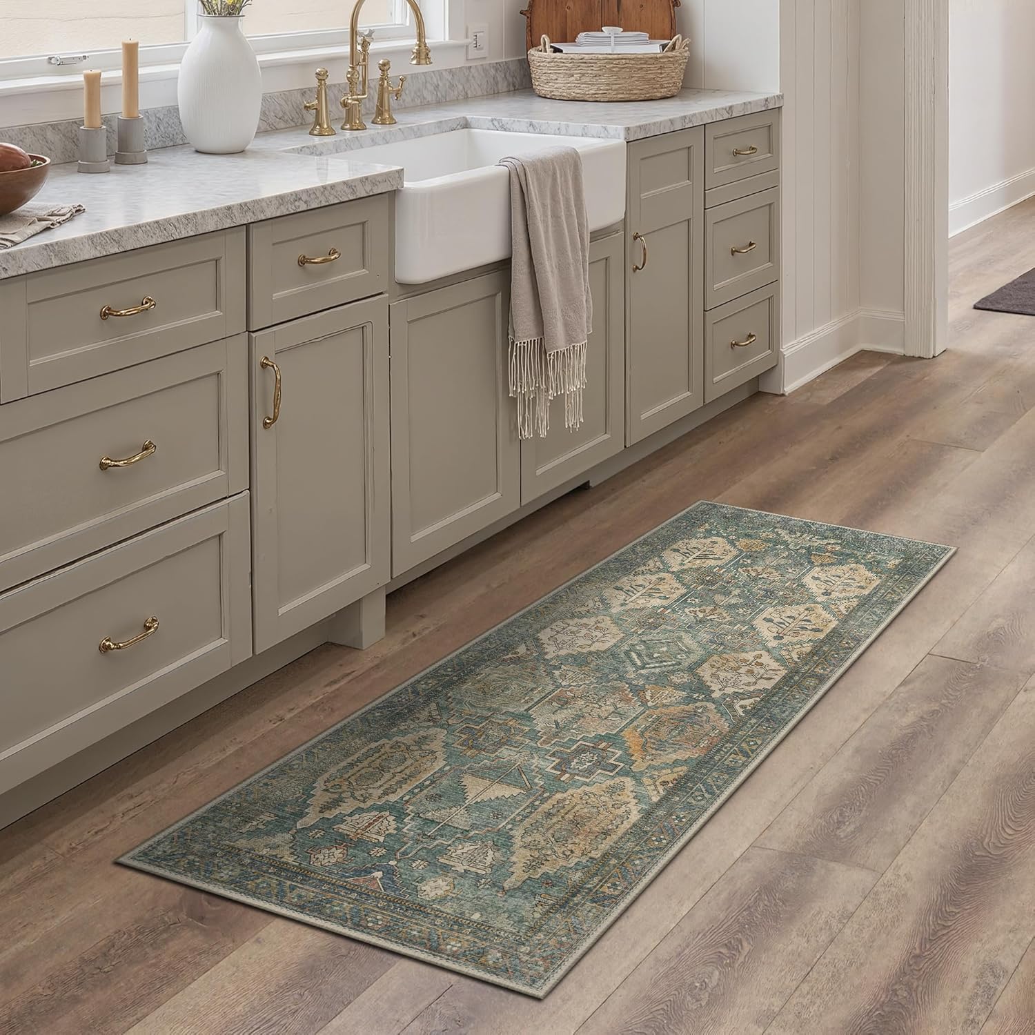 GENIMO 2x5 Runner Rugs for Hallway, Machine Washable Non Slip Vintage Rugs, Low Pile Lightweight Soft Print Rug for enrtyway, Corridor, Home Office, Kitchen, Sage Teal
