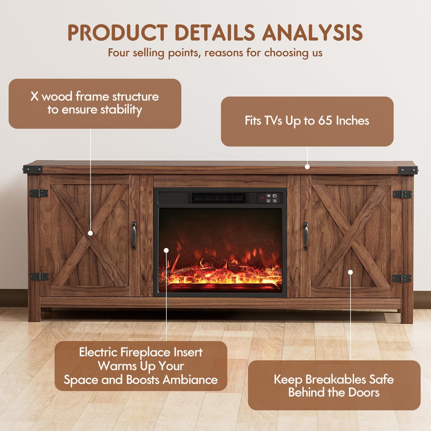 YESHOMY Fireplace TV Stand with Two Barn Doors and Storage Cabinets for Televisions up to 65+ Inch, Entertainment Center Console Table, Media Furniture for Living Room, 58 Inch, Brown