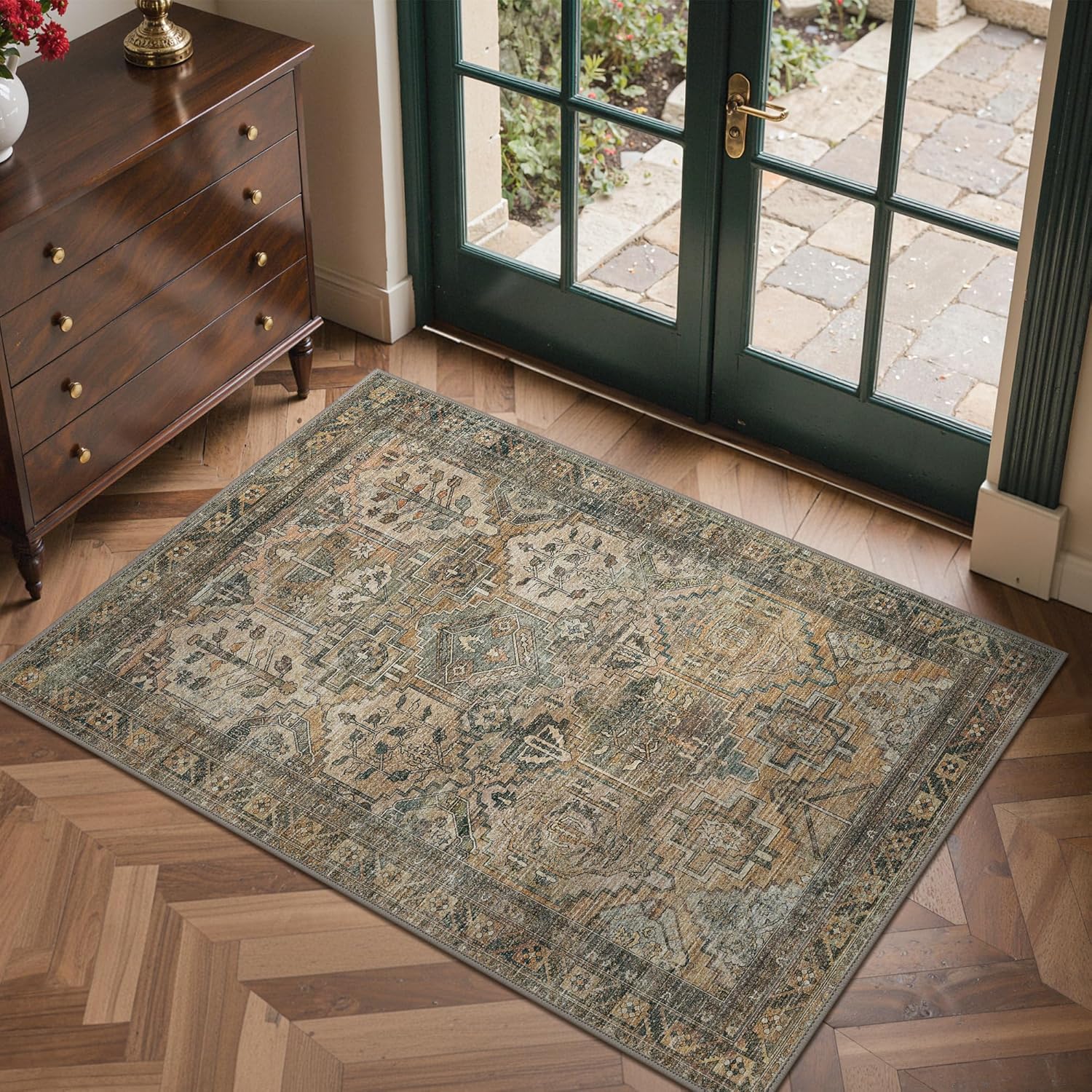 GENIMO 2x3 Area Rugs for Living Room, Machine Washable Non Slip Vintage Rugs, Low Pile Lightweight Chenille Print Rug for Bedroom, Dining Room, Home Office, Warm Taupe