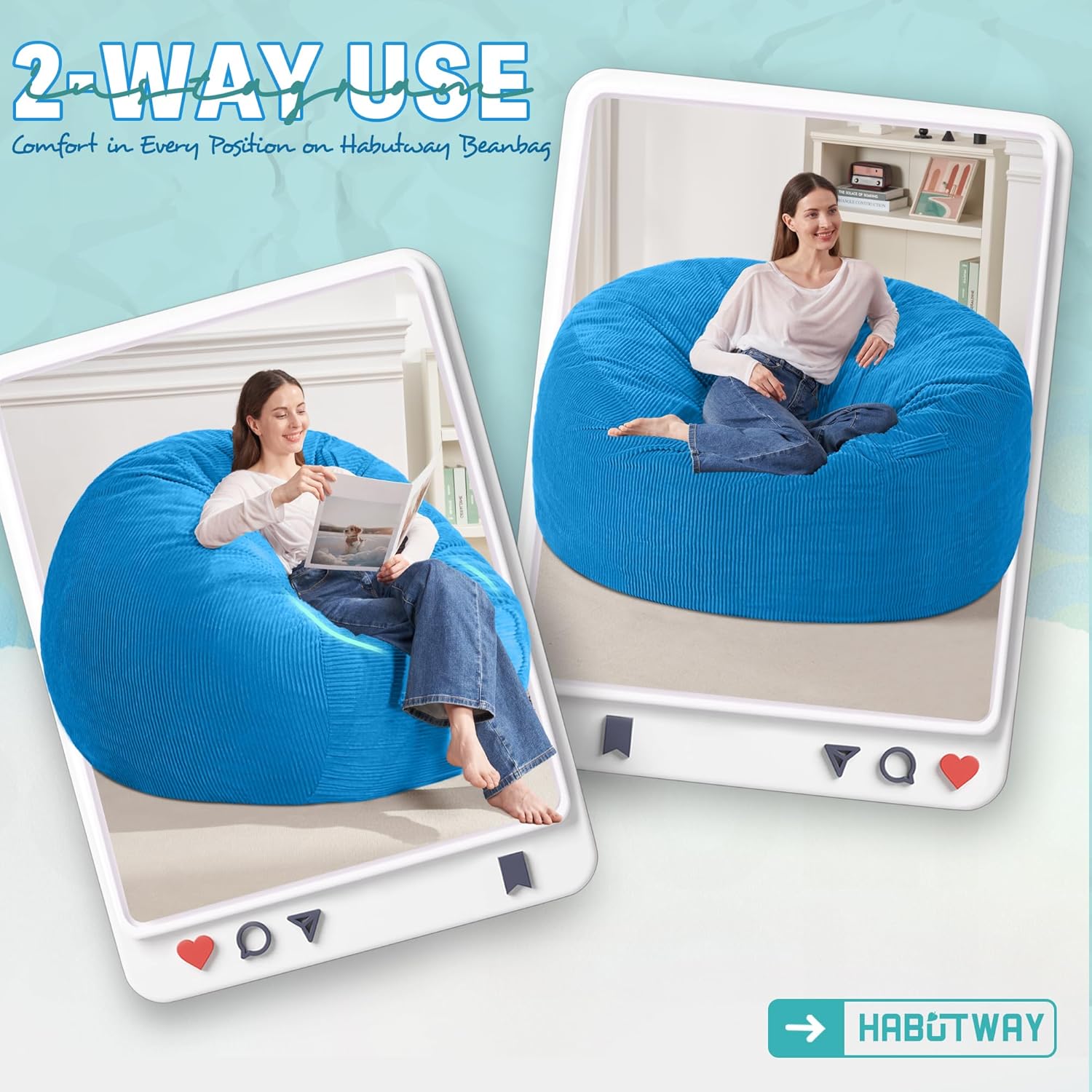 HABUTWAY 3FT Bean Bag Chair,Giant Bean Bag Chairs for Adults,Big Bean Bags with Memory Foam Filled, Large Beanbag Chairs with Soft Corduroy Cover-Blue