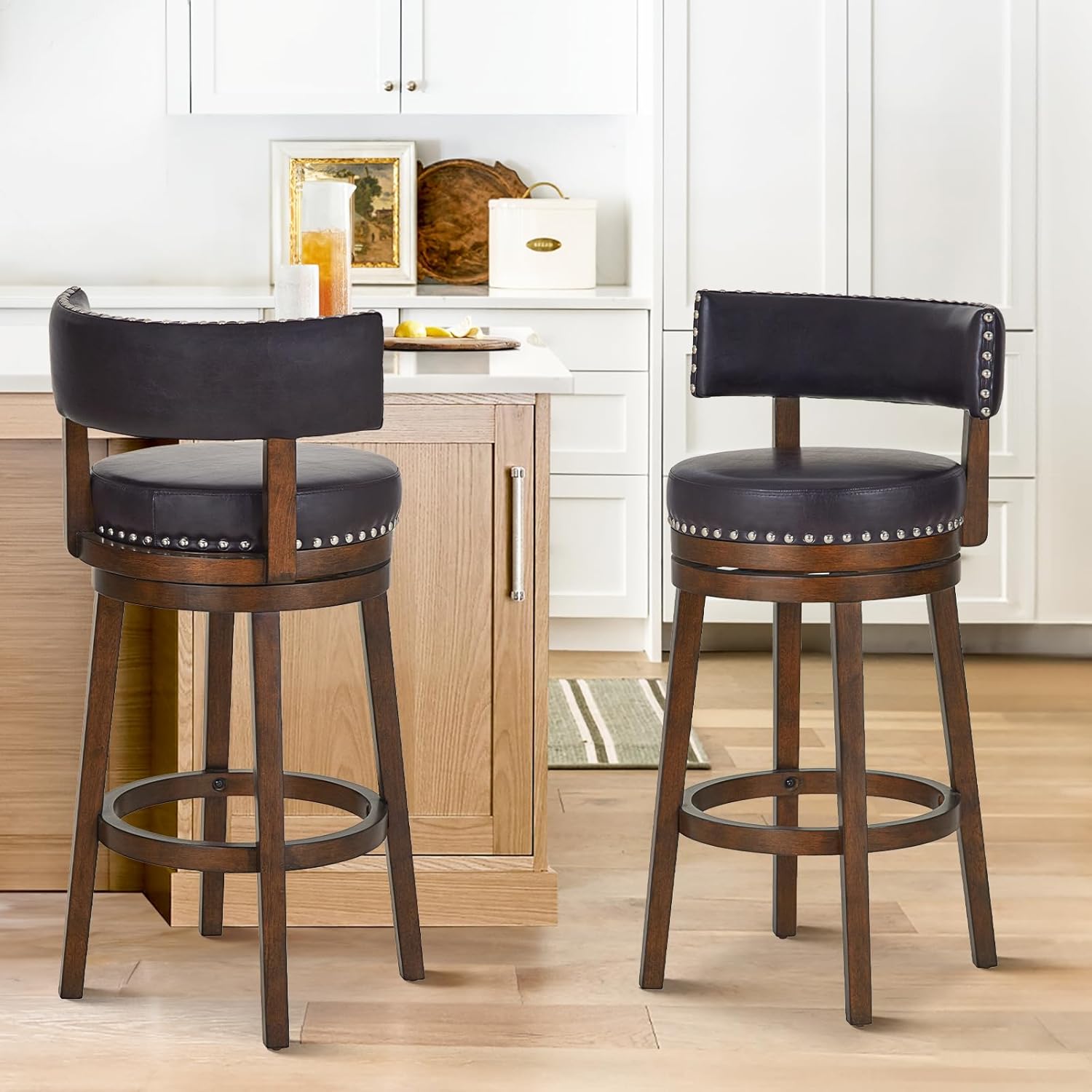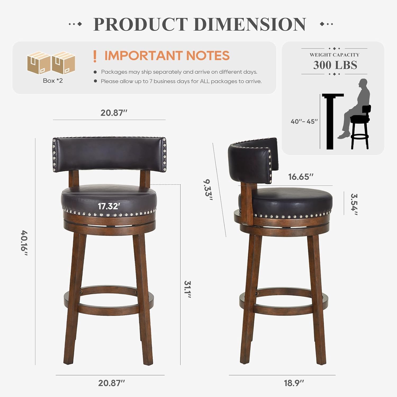 COLAMY Swivel Bar Stools Set of 2, 30 Inch Swivel Bar Height Bar Stools, Wood Swivel Barstools with Back, Modern Upholstered Wooden Barstools for Kitchen Island Dining Room Bar, Dark Brown