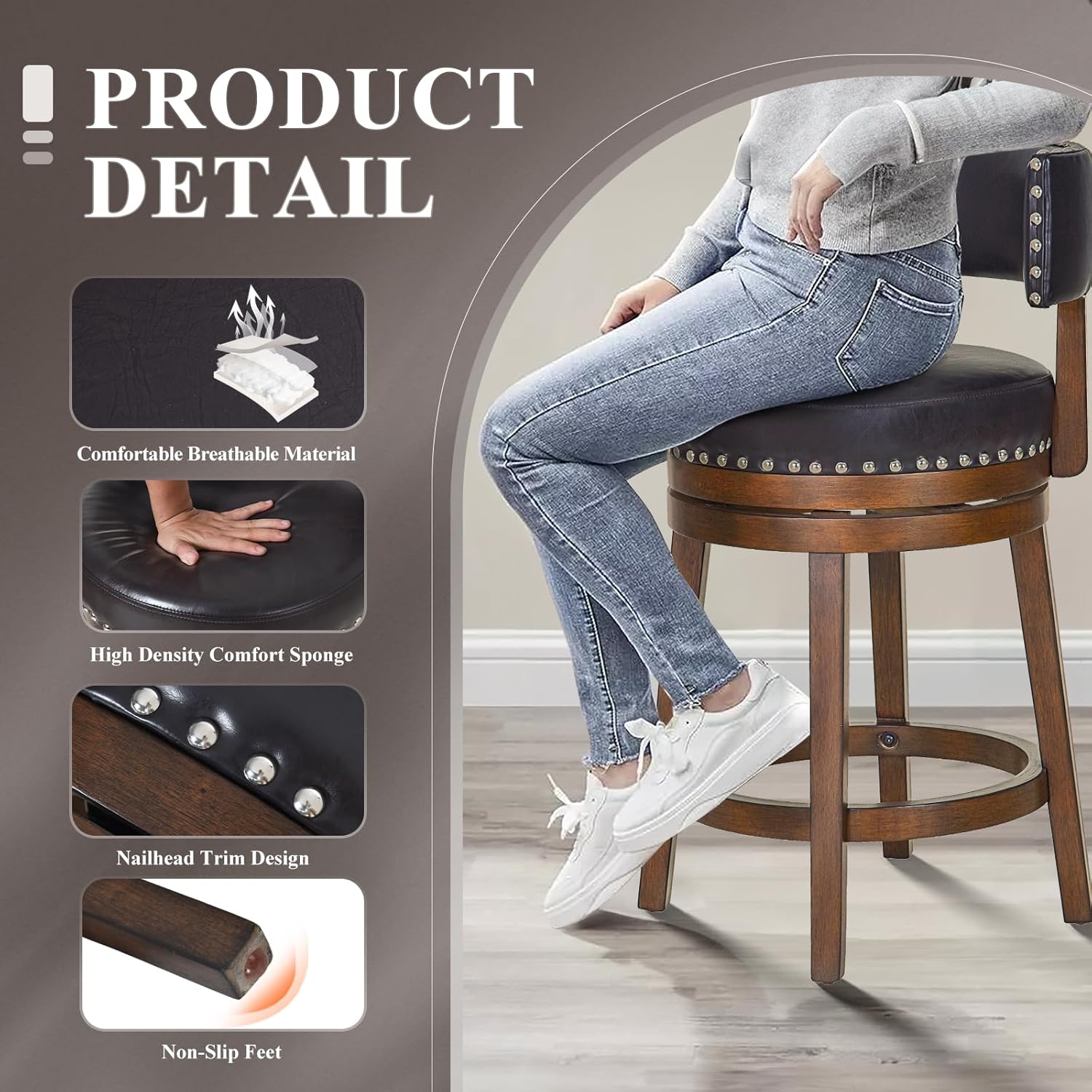 - 【Ergonomic Design Barstool with Back】The 360-degree swivel bar srool with a wooden backrest is designed with meticulous attention to ergonomics. The seat and backrest are curved to greatly fit the body's contours, providing excellent support to the back, waist, and hips. This allows users to maintain a comfortable sitting position for long periods without experiencing fatigue or discomfort.