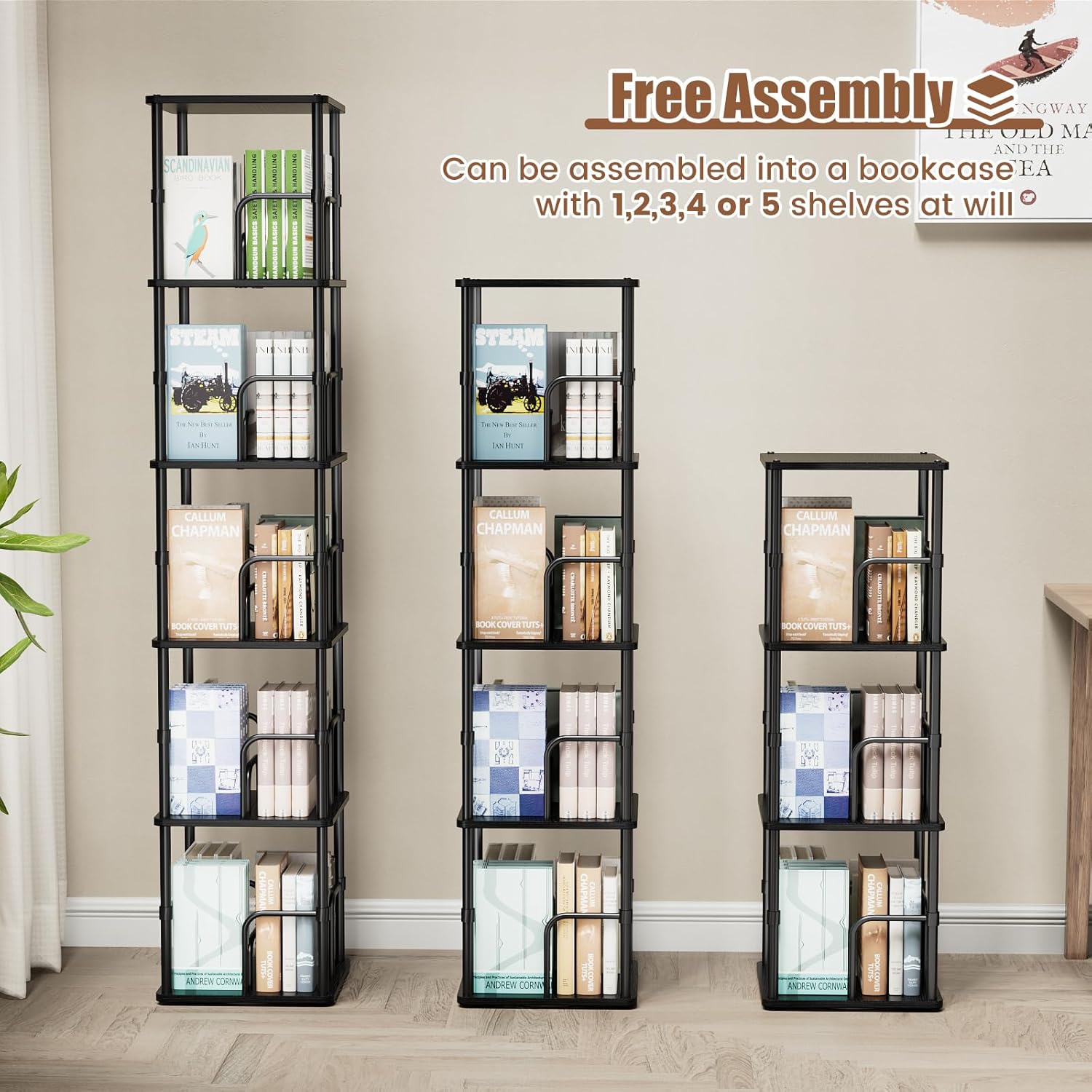 - 【Free and Easy Assembly Mode】:Allstand swivel bookcase can be assembled into a 1-5 layer book shelf as you wish,adjustable shelf height for greater ease of use. Additionally, making it easier to complete the installation, the turntable bookshelf comes with step-by-step instructions and all marked tool parts, you can assemble the book case within 30mins easily.