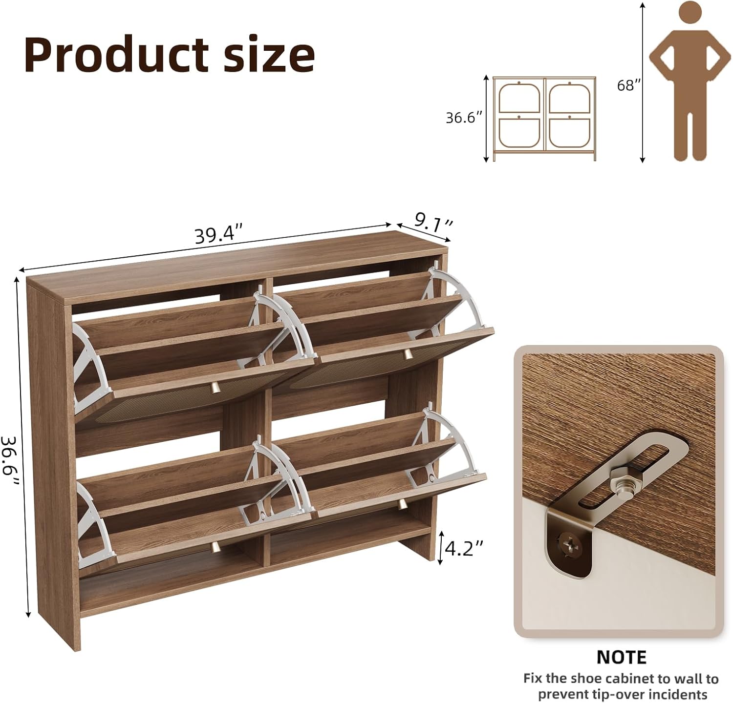 - Spacious & Versatile Shoe Organizer:The shoe organizer offers Includes 4 flip drawers, helping keep your space tidy. The flip-door section provides flexible storage, suitable for shoes of various styles. The cabinet features three adjustable partitions, allowing you to modify the middle partition to accommodate different types of shoes, including flats, sneakers, and mid-calf boots.