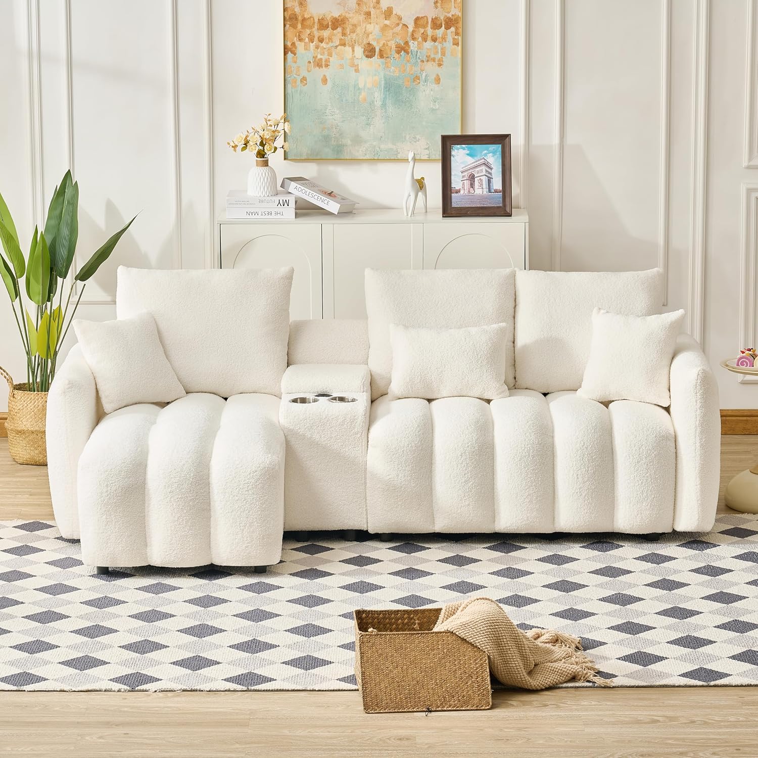 92-Inch Teddy Boucle Tufted Sofa Couch with Storage Console and Chaise Lounge, L-Shaped Left Facing Corner Sectional Sofa Couch with Cupholders, USB Ports and Golden Accent for Living Room Office