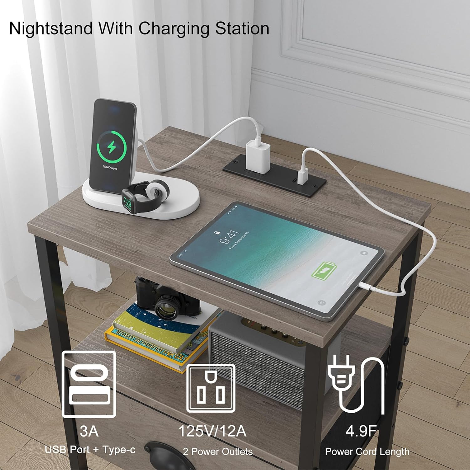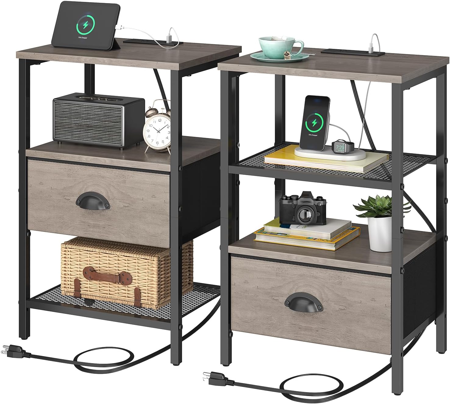 Nightstands Set of 2, Night Stands with Charging Station and Fabric Drawer, Grey Bedside Tables with Drawer, 2- Tier Side Table with Storage, Nightstands with Charging Station,Grey