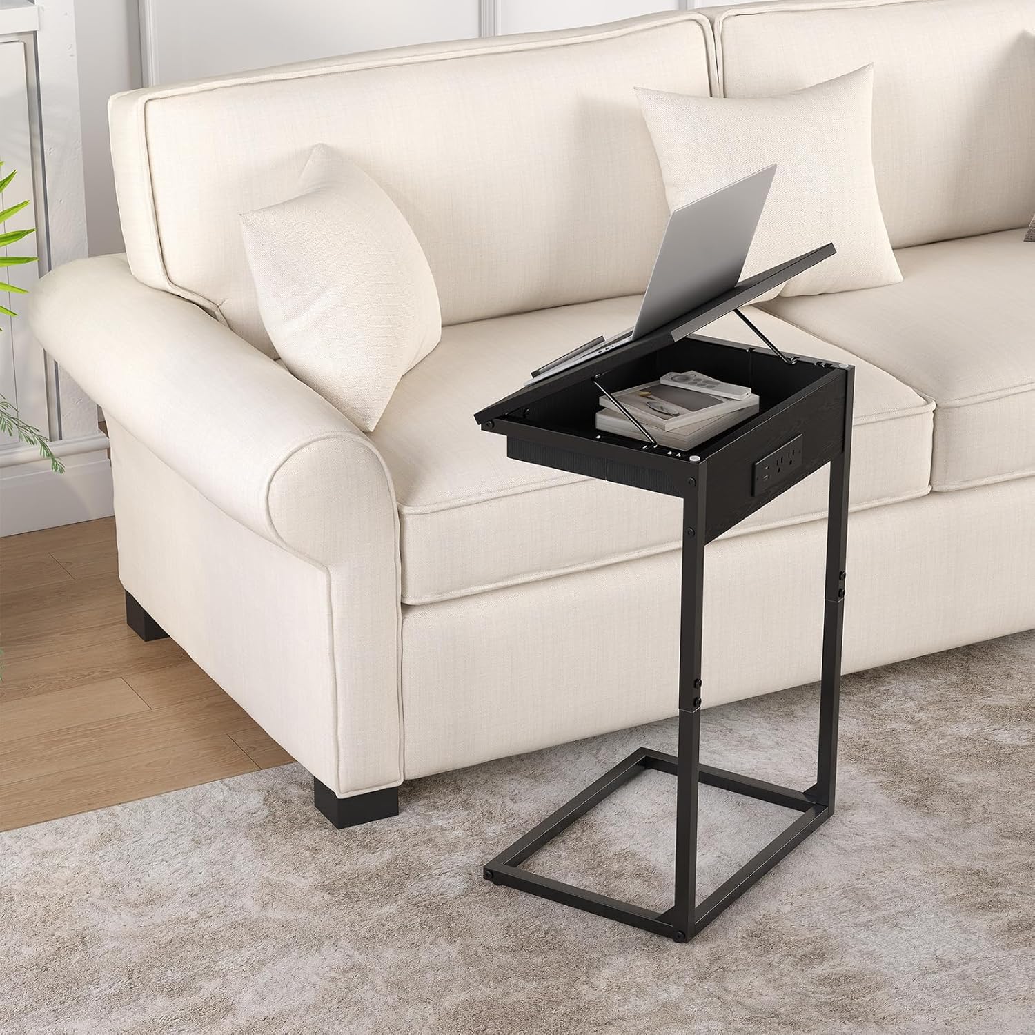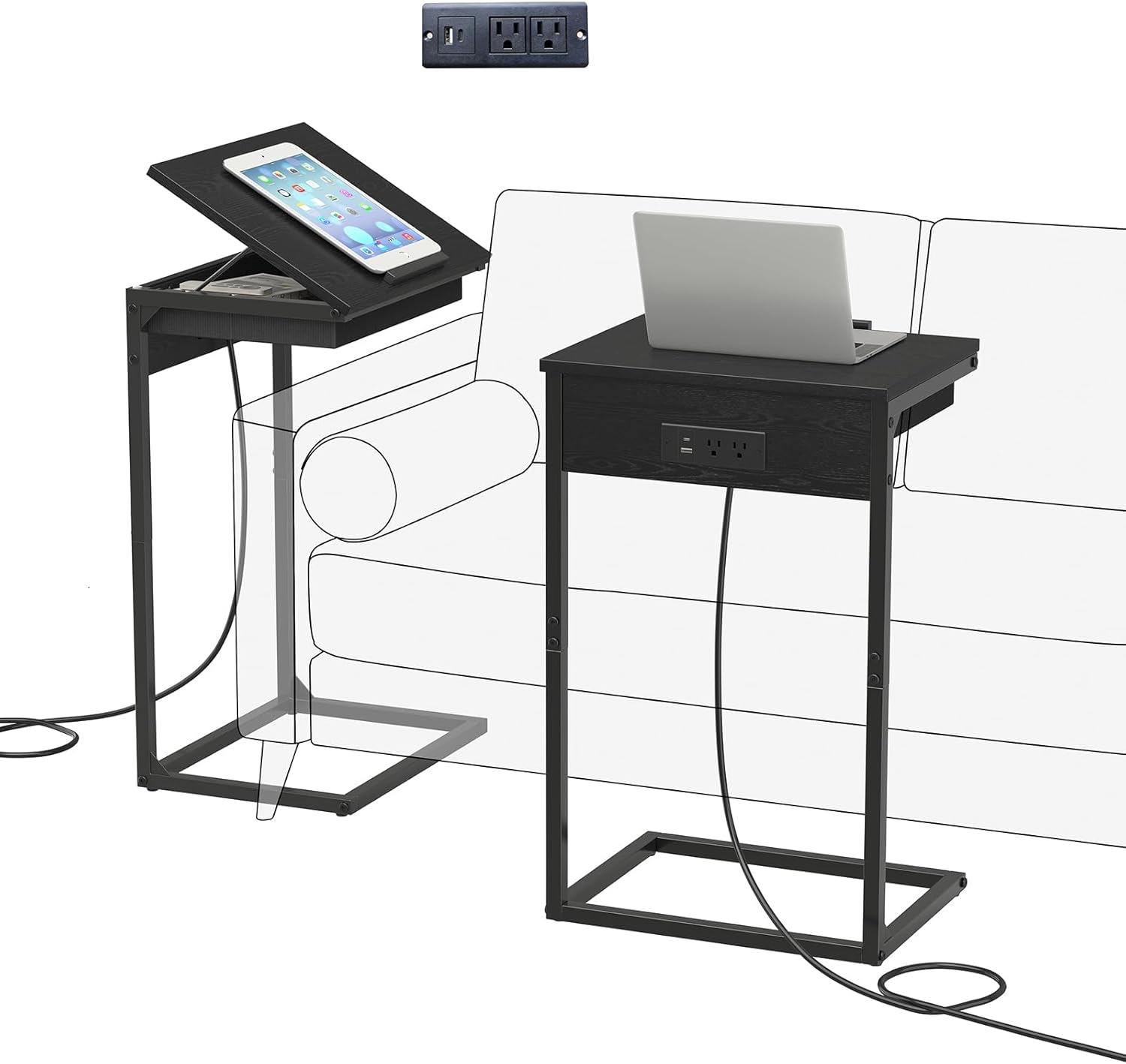 C Shaped End Table with Charging Station,45° Tiltable Adjustable Flip Top Side Table Set of 2,Small C Table Set 2 for Small Spaces,Slide Under Couch Sofa Bedside Table Living Room, Black