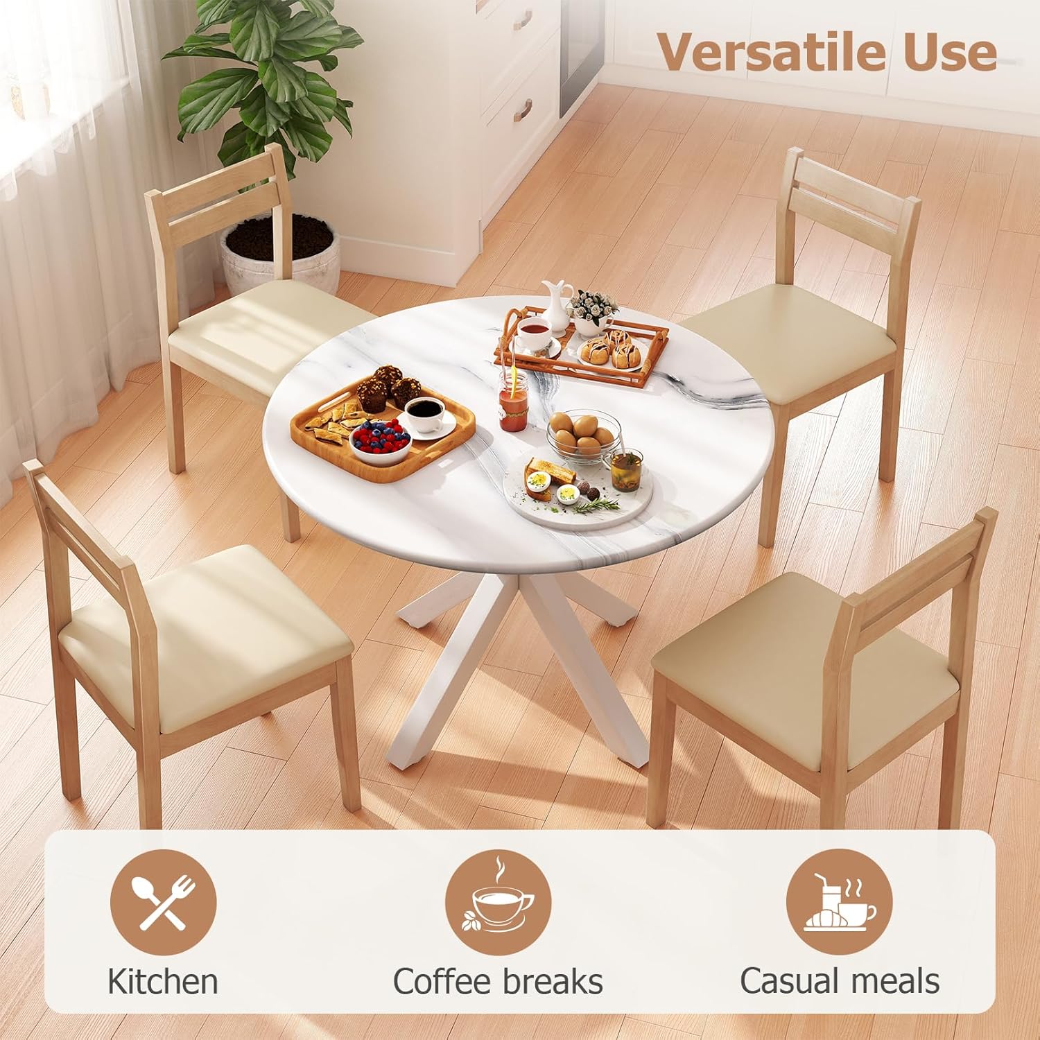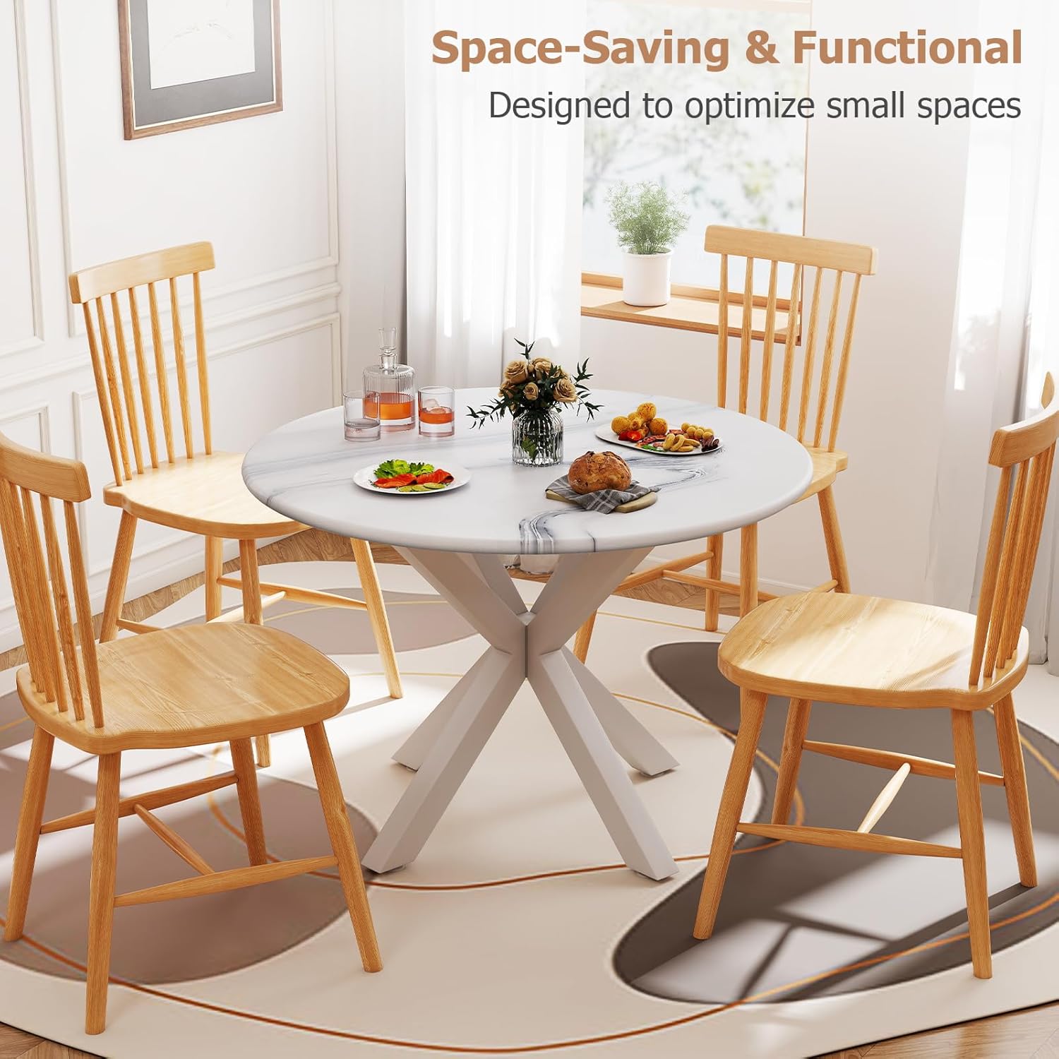 - 【Space-Saving & Functional】The compact round kitchen table is designed to optimize small spaces. Its cornerless design allows for easy addition of extra chairs—accommodating up to 6 people comfortably. It enhances mobility and flow, making it ideal for small dining areas.
