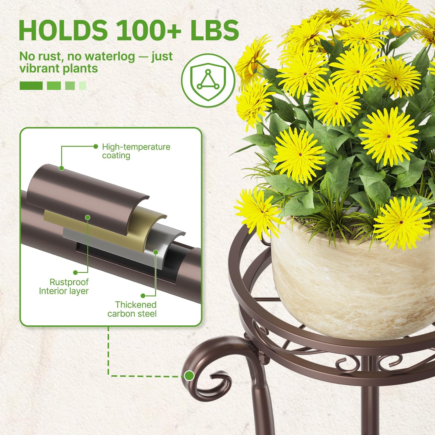 - 【Weatherproof Wipe-Clean】Whether it's a rainy day or a splash from watering, our waterproof and rust-proof coating keeps your plant stands looking brand new. Just wipe it down, and it's good to go. No more worrying about rust or faded finishes—your stand will stay shiny for years.