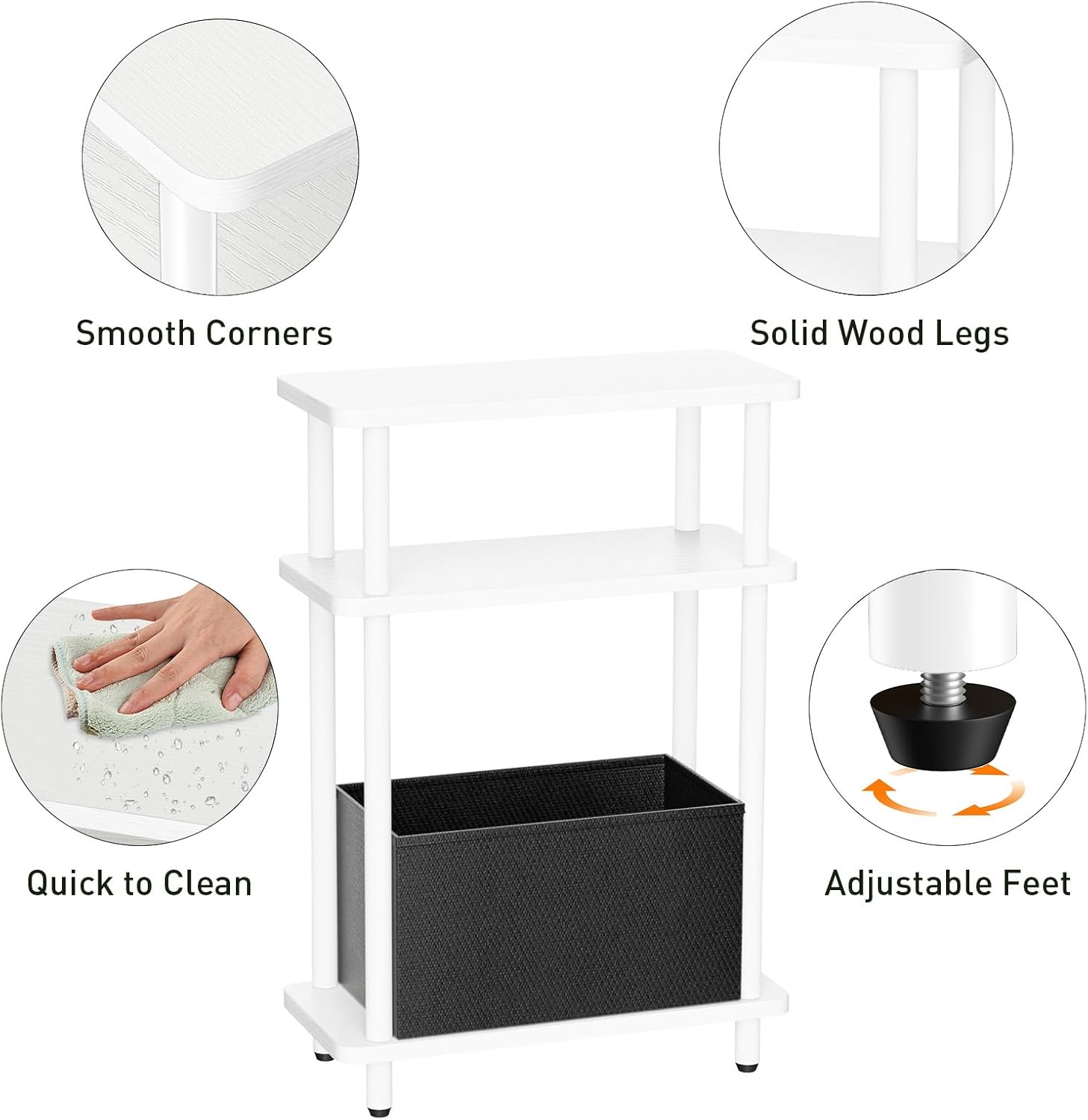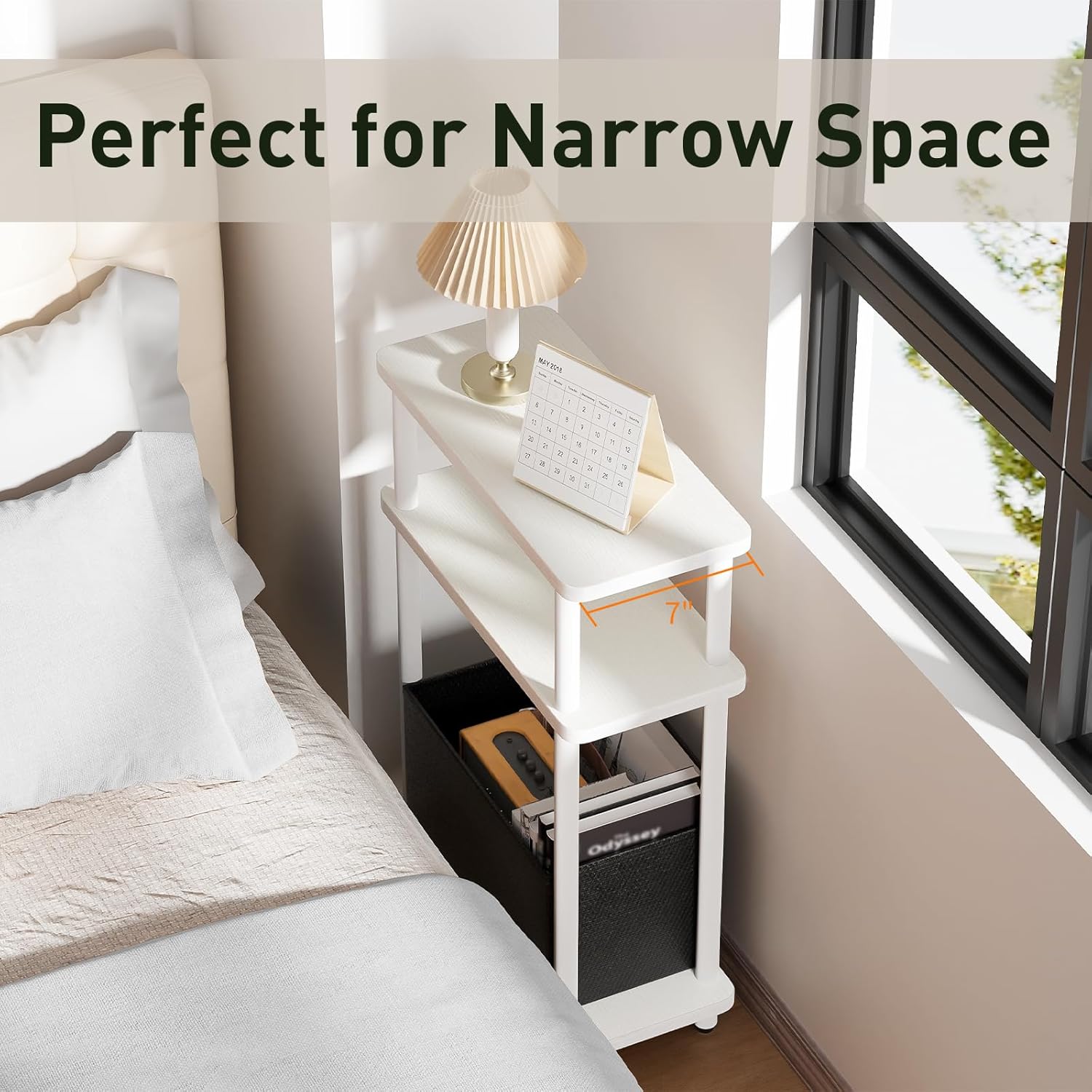 Narrow Side Table with Fabric Basket, 7" Wide, 3 Tier Skinny End Table with Wood Legs, Slim Nightstand/Bedside Table for Small Spaces, with Adjustable Feet, 15.7" L x 23" H, White
