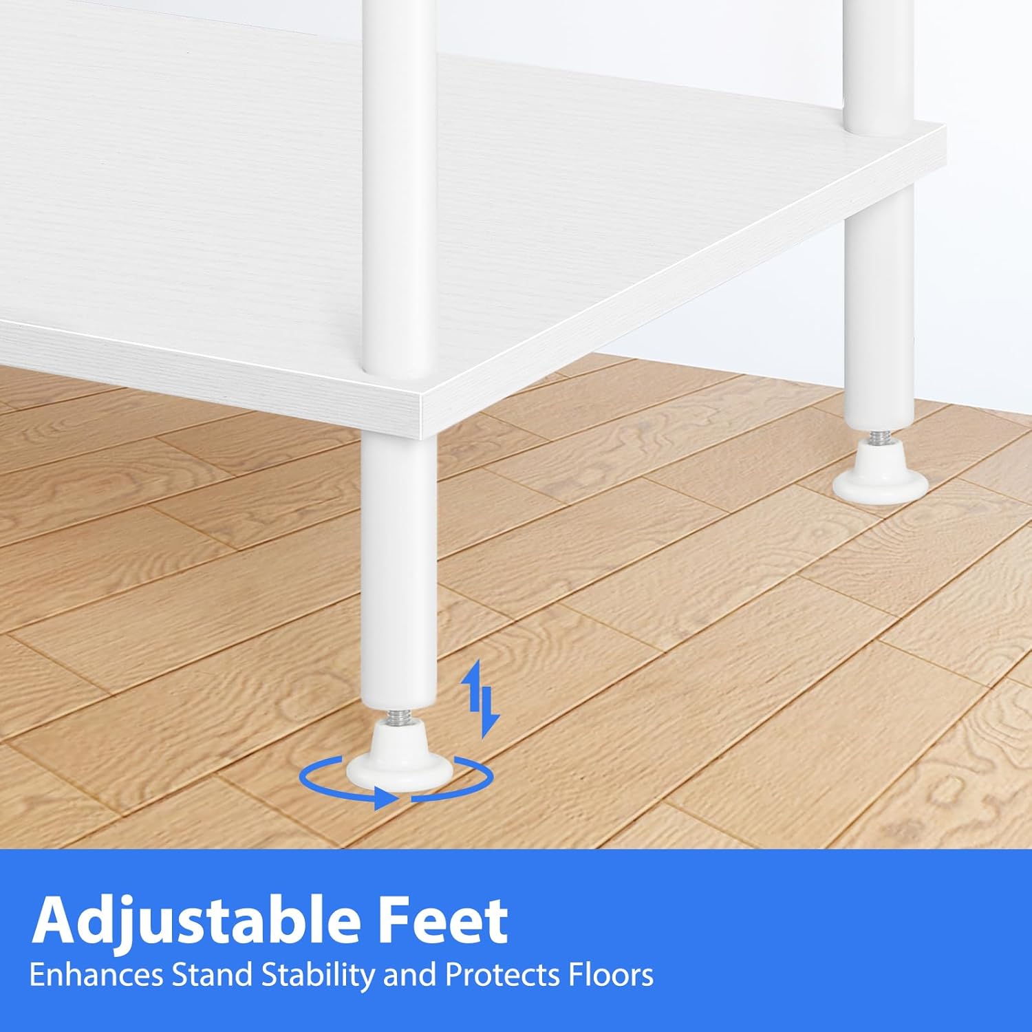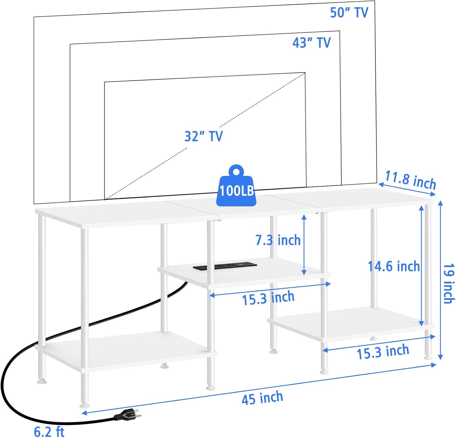 - Sturdy TV Stand: BTY wood TV stand is constructed from premium MDF with a metal frame. It supports a maximum load of 100 lbs and is compatible with 32", 43", and 50" TVs. Its stylish industrial farmhouse style easily blends in with your furniture. Adjustable feet enhance the white TV stand's overall stability