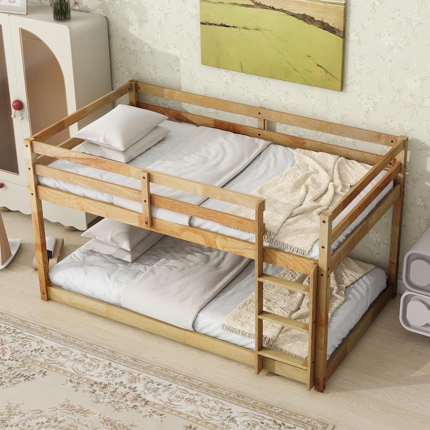 - 【Space-Saving Twin Design】 This twin over twin bunk bed features a low height for enhanced stability and versatile room use. The wider ladder steps on this bunk bed provide solid, easy climbing.