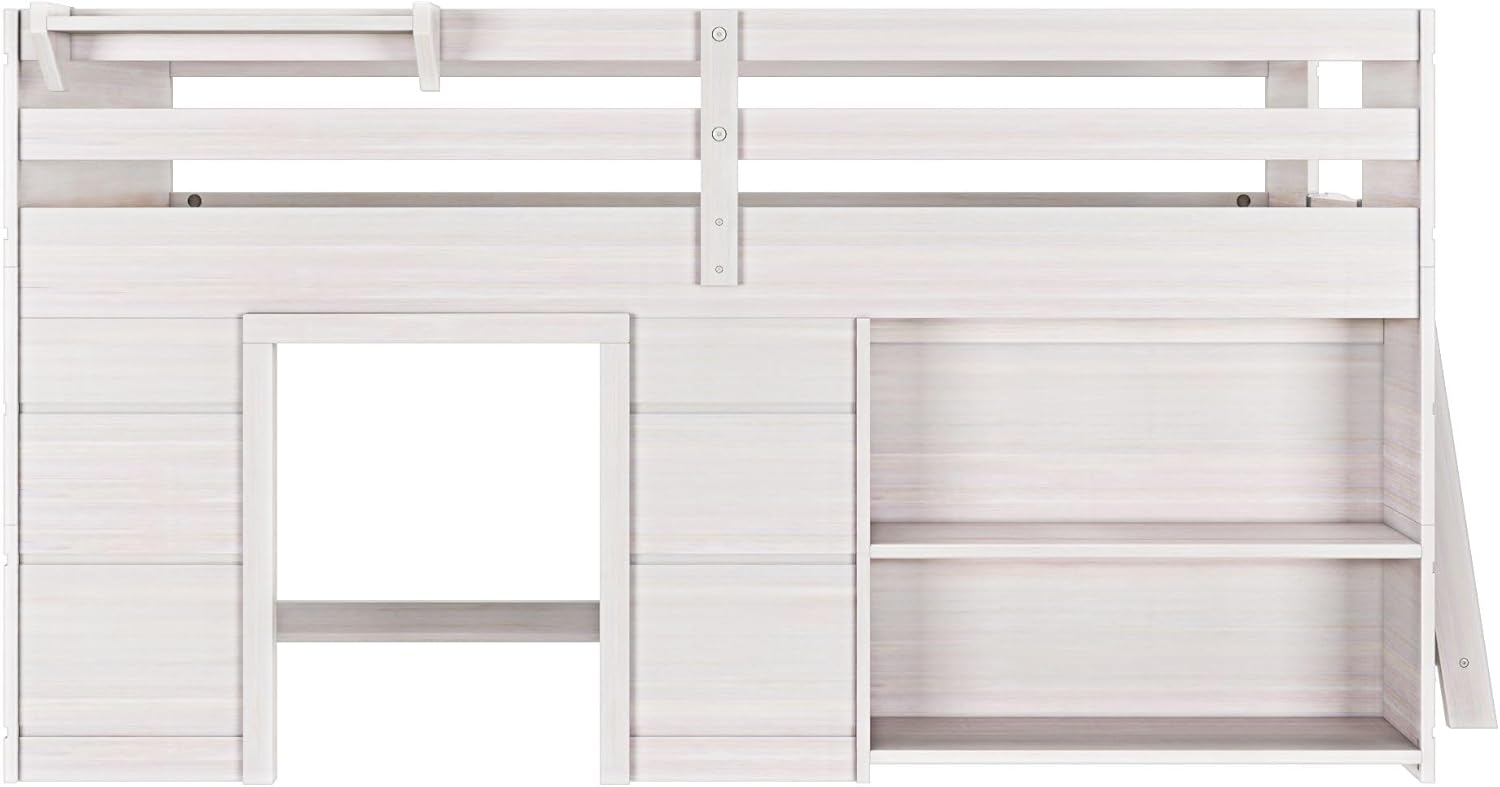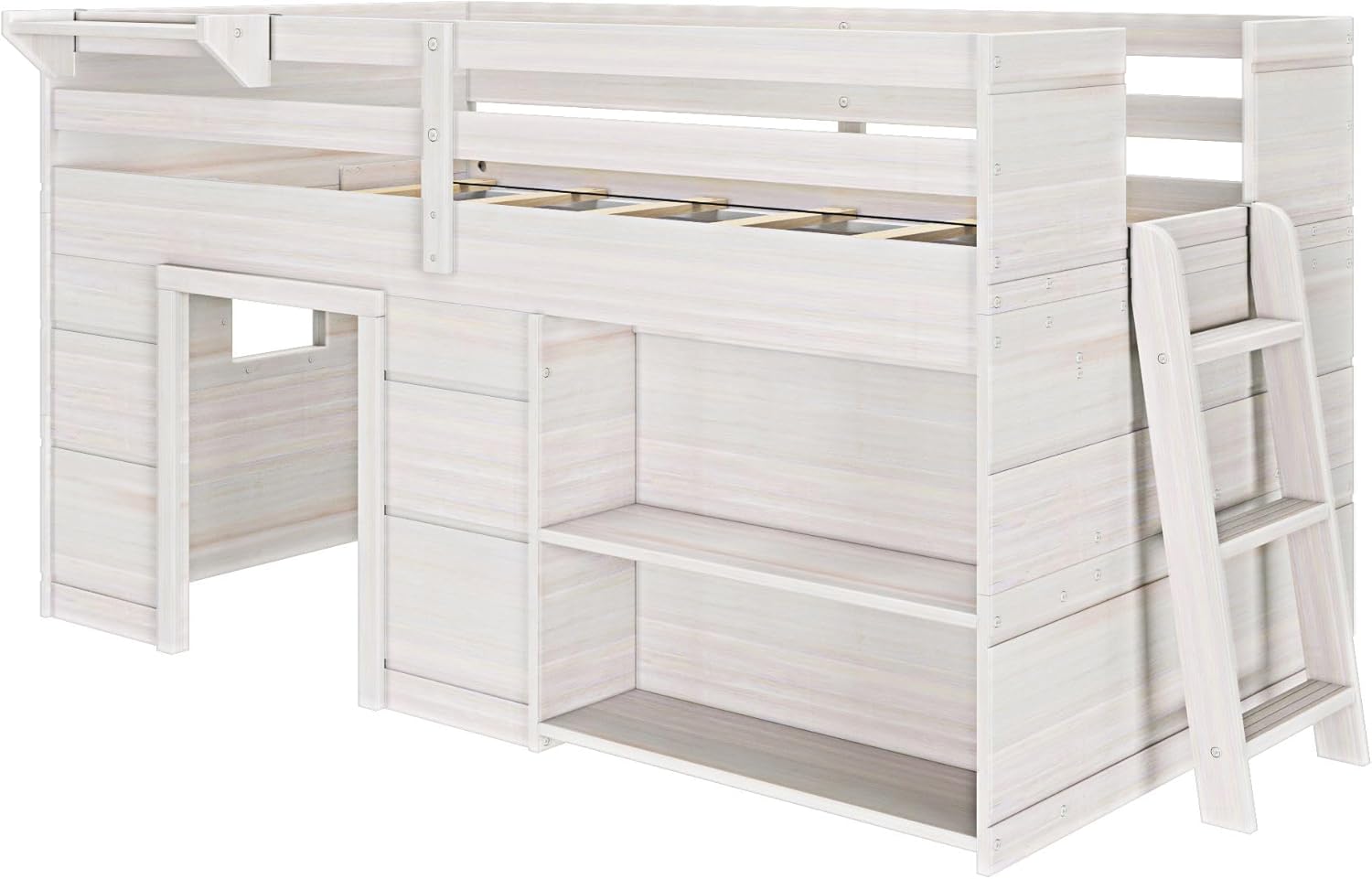 Max & Lily Modern Farmhouse Twin Low Loft Bed with Bookcase - Solid Wood, 15” Guardrails, 400-lb Capacity, Low-VOC Finish, White Wash