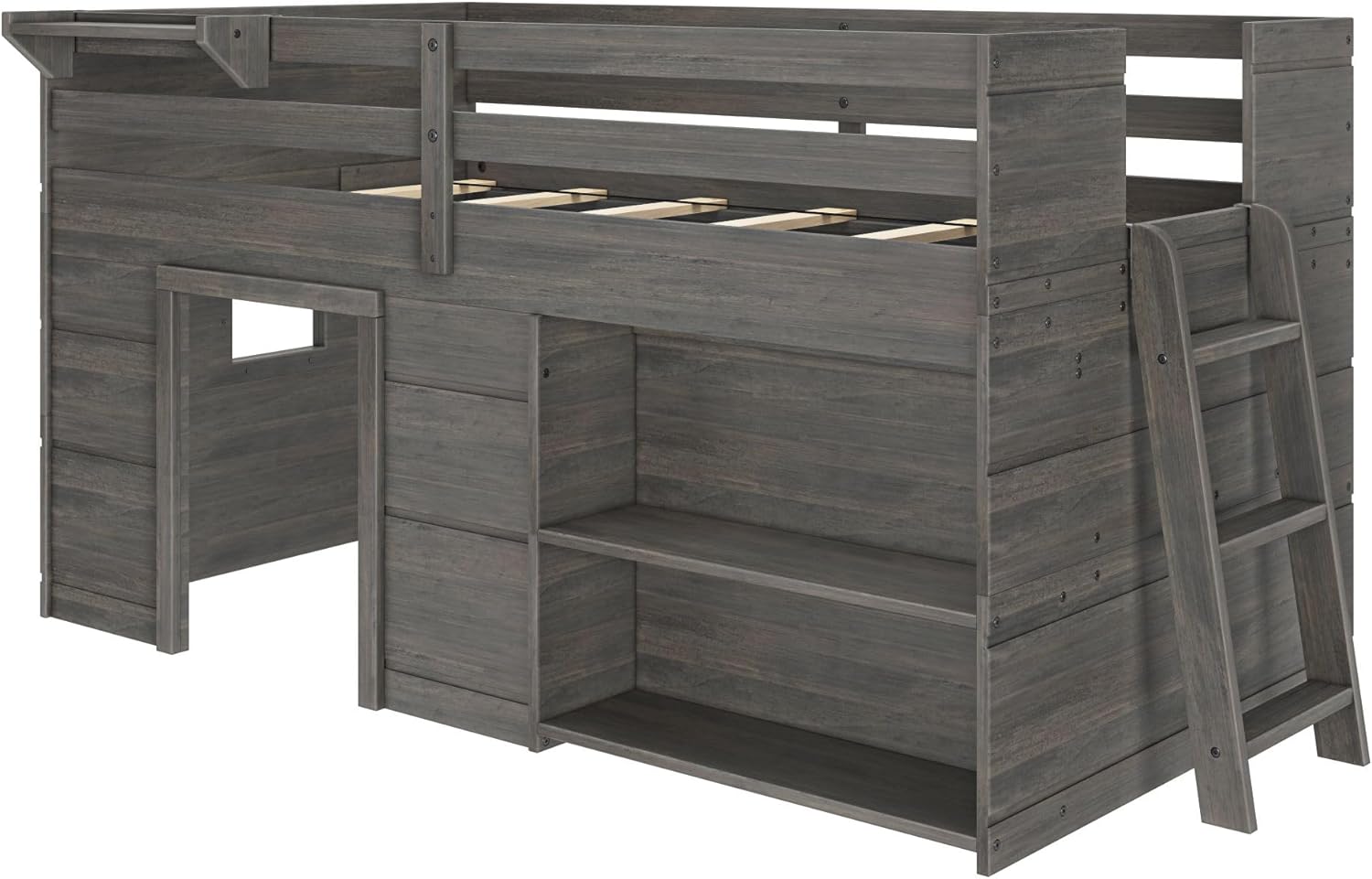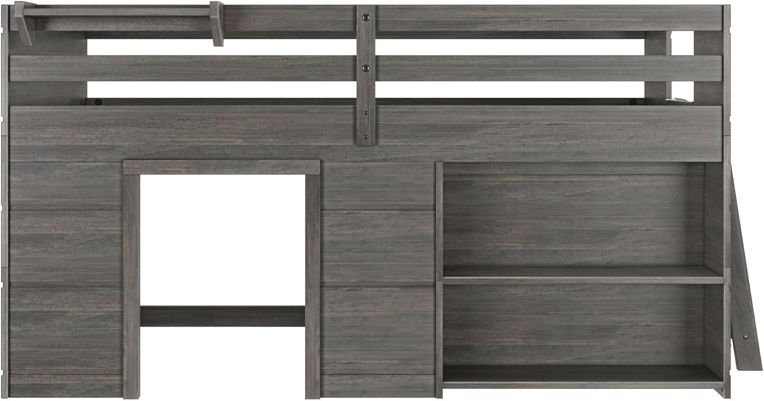Max & Lily Modern Farmhouse Twin Low Loft Bed with Bookcase - Solid Wood, 15” Guardrails, 400-lb Capacity, Low-VOC Finish, Driftwood