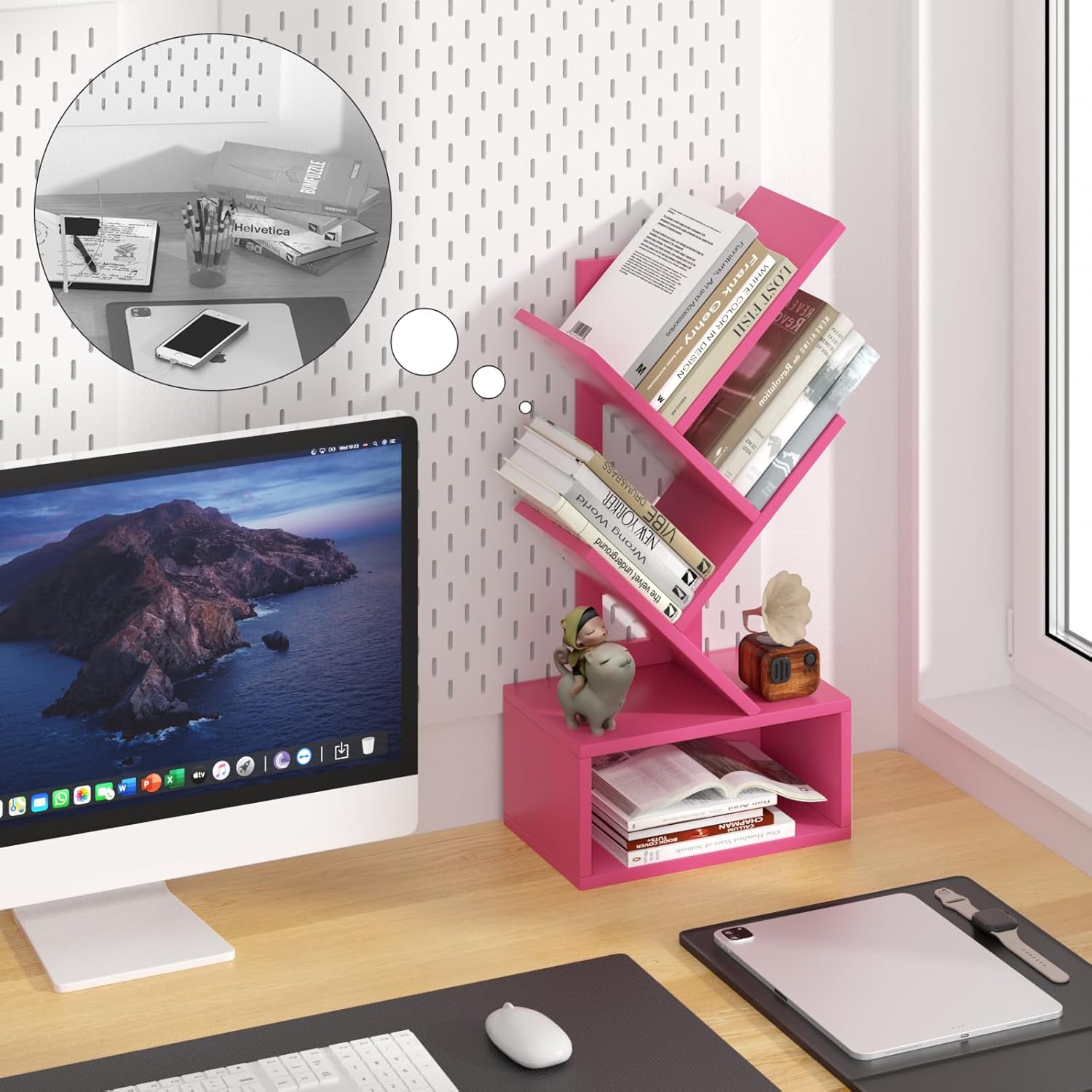 - š² [Small Tree Bookshelf] The inspiration for this 5-tier small tree bookshelf comes from trees in nature. The tree-shaped design provides ample categorized storage space for your books and office supplies, helping to keep your desktop clutter-free. This charming bookshelf is a perfect companion for you and your family while working and studying.