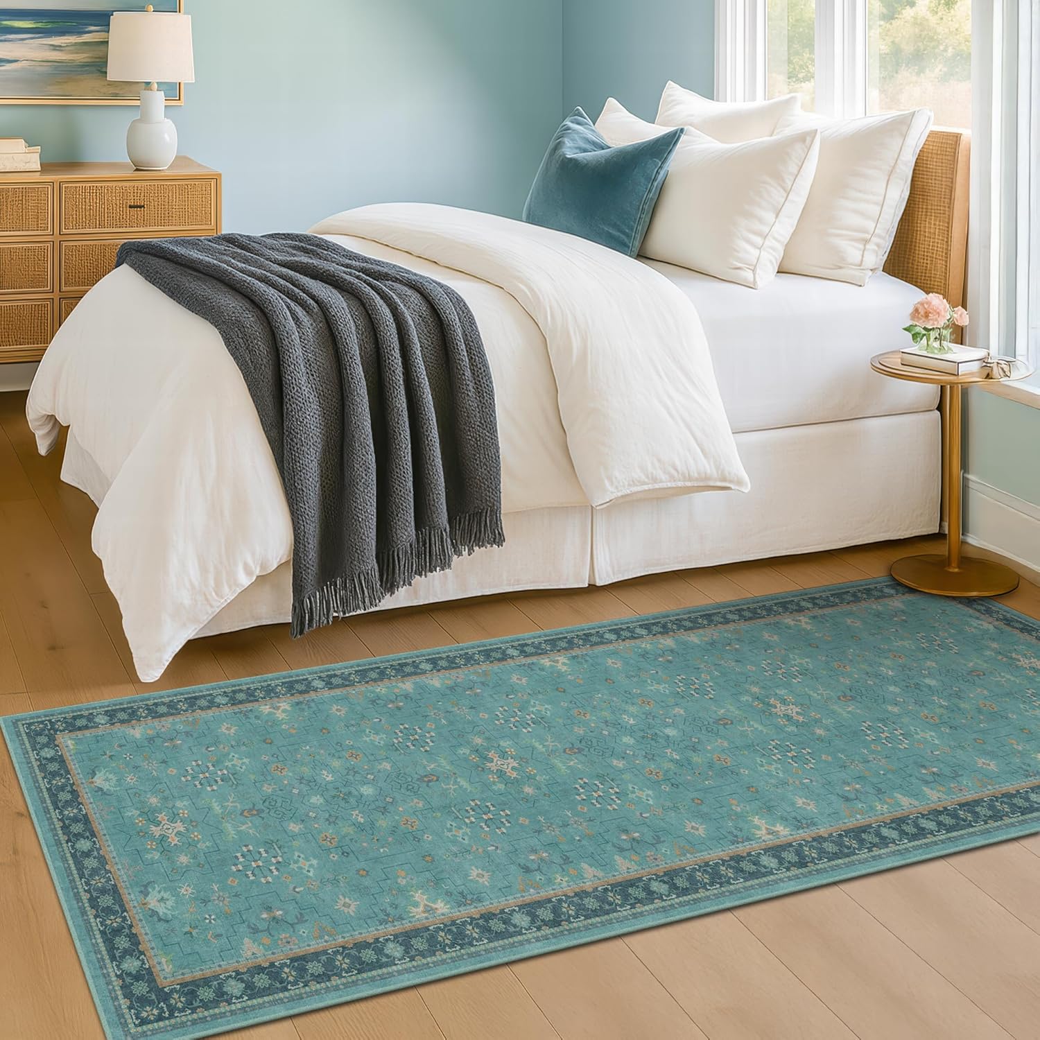 - Thoughtful Details: While folded rugs may arrive creased, simply roll them out and allow time for the fibers to settle. Vacuuming with a soft brush and gently machine-washing in cold water will help maintain its pristine appearance