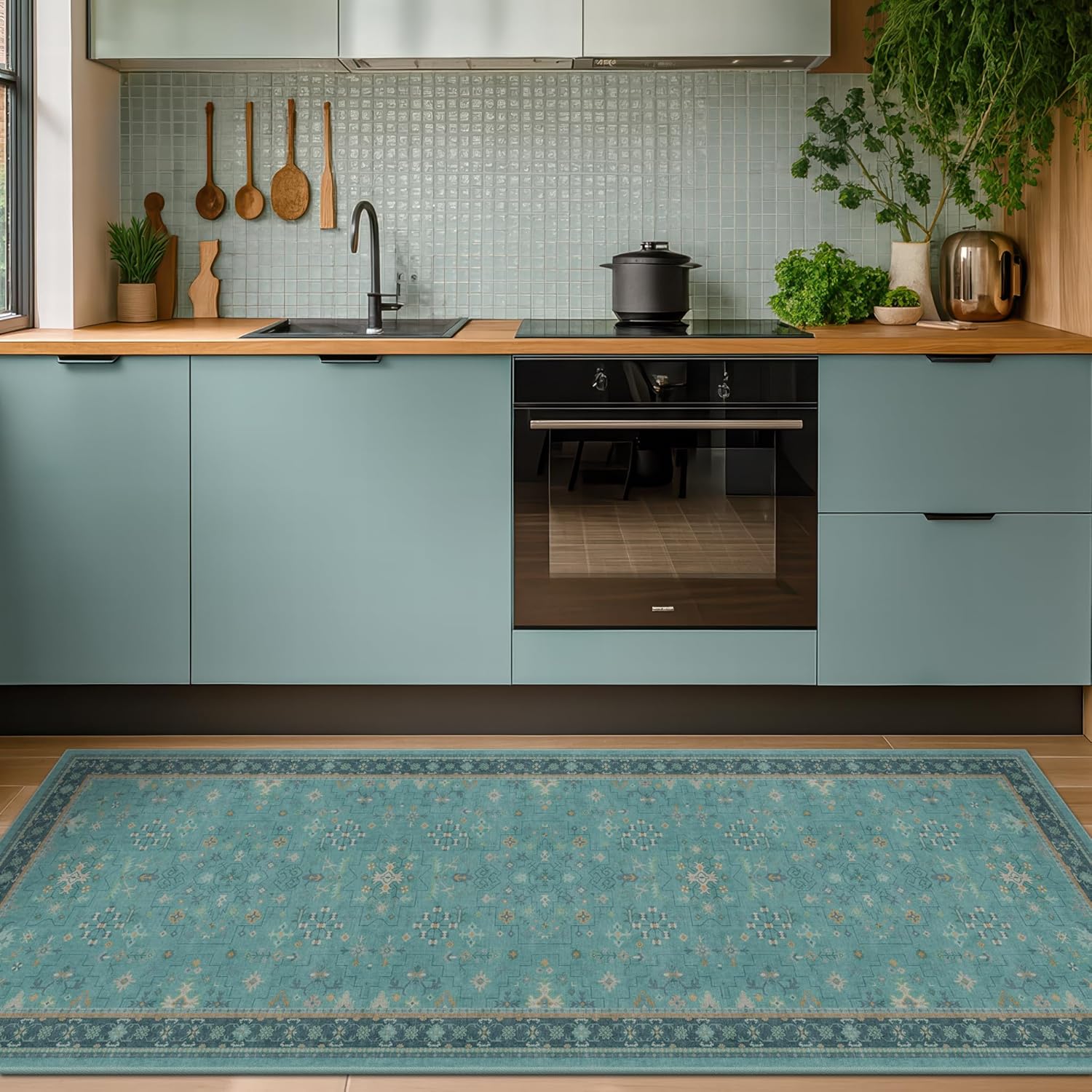Boho 2x6 Non Slip Kitchen Rug Runner - Teal Washable Rug for Bathroom, Laundry Room, Hallway, Non Slip with Rubber Backing, Floral Aqua Blue Unique Runner Décor