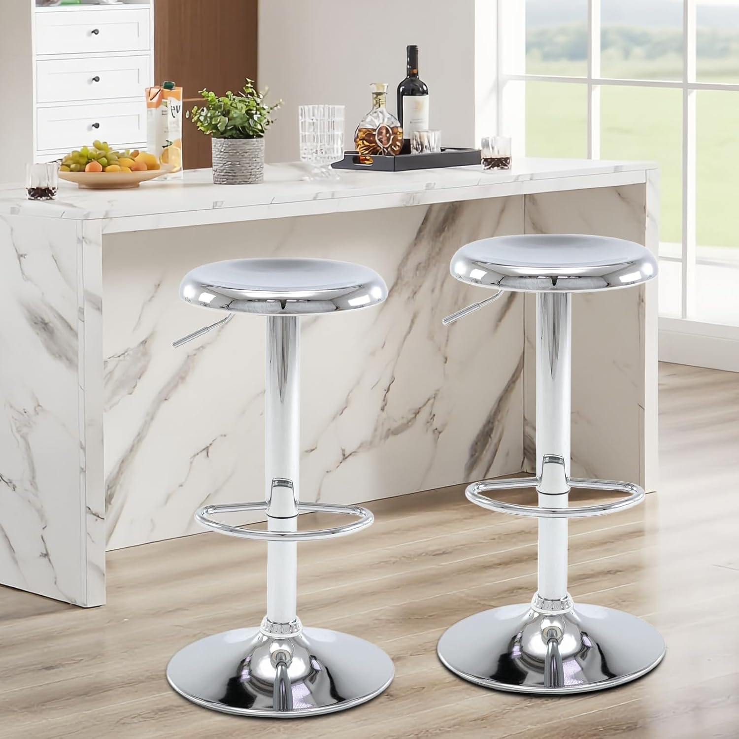 Bar Stools - 2 Pack, Adjustable Swivel Height Counter Bar Stool, Modern Metal Barstools, Backless Barstool for Bar, Kitchen Island, Pub, Silver