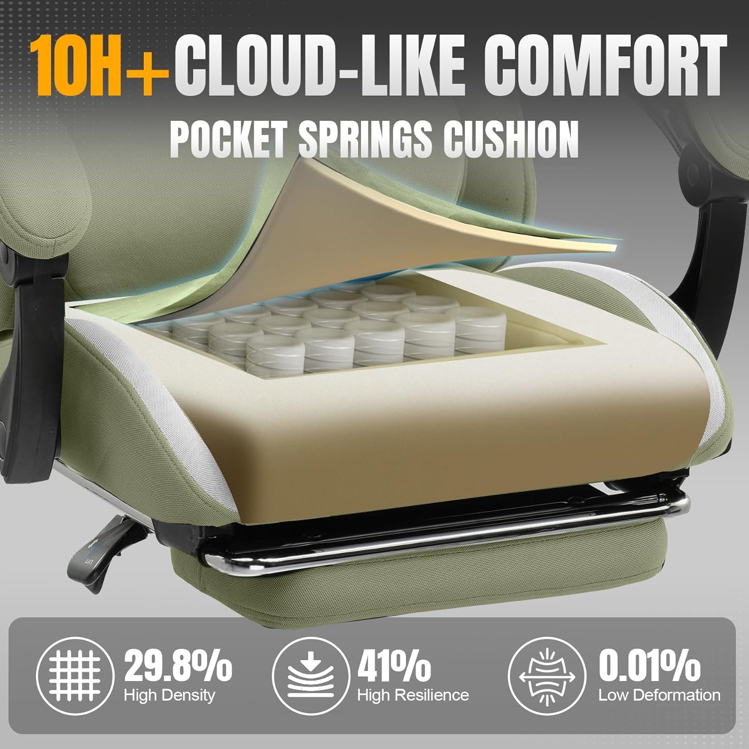 - Cloud-like Comfort with Pocket Springs: Inserted the individually pocketed springs into seat cushion. Each spring flexibly adjusts based on force points, jointly enabling precise weight distribution. Wrapped with 45D high-resilience sponge outside, it ensures no collapse during long sitting and buffers vibrations subtly. The shape and support duration are 50% longer than traditional material