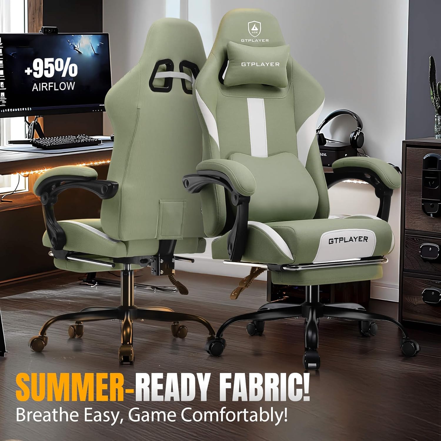 GTRACING Gaming Chair with Foot Rest & Pocket Spring Cushion, Breathable Fabric for Home Office Desk, Ergonomic High Back Computer Chair with Headrest & Lumbar Support, Green