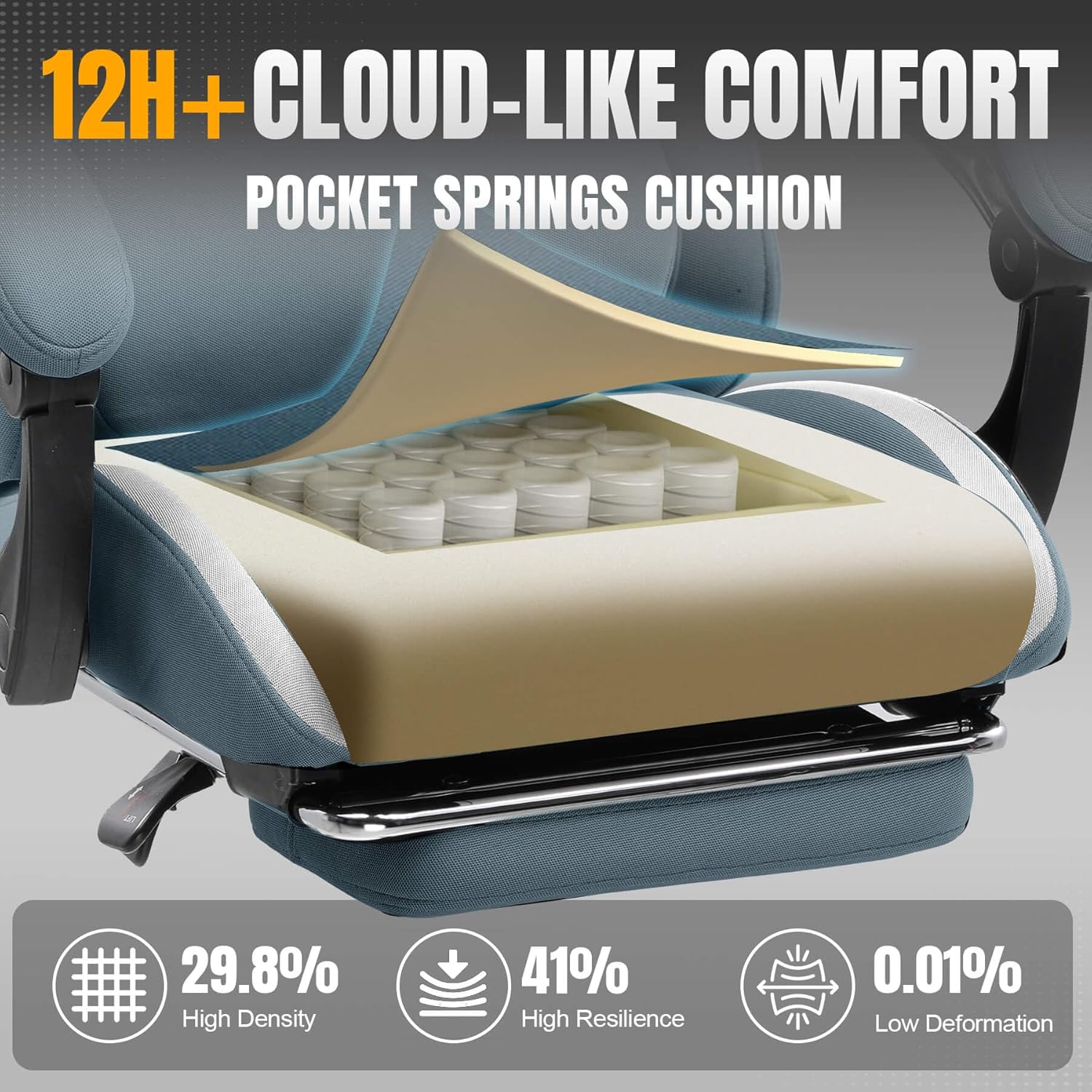 - Cloud-like Comfort with Pocket Springs: Inserted the individually pocketed springs into seat cushion. Each spring flexibly adjusts based on force points, jointly enabling precise weight distribution. Wrapped with 45D high-resilience sponge outside, it ensures no collapse during long sitting and buffers vibrations subtly. The shape and support duration are 50% longer than traditional material