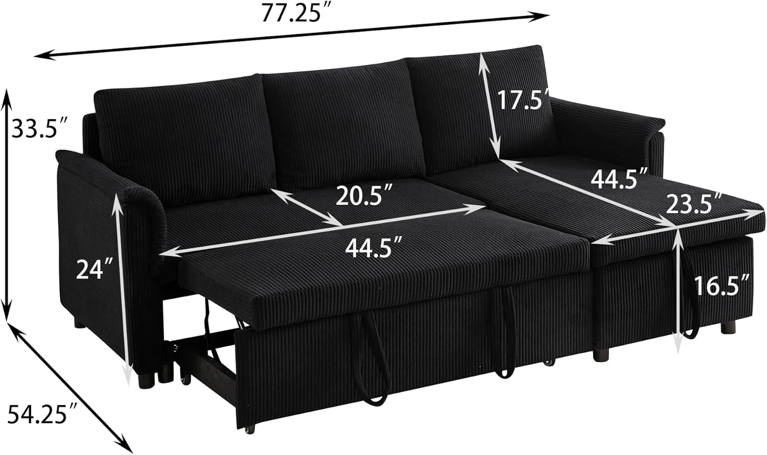 Ball & Cast L-Shape Reversible Sectional Sleeper Sofa Bed 4 in 1 Pull Out Couch with Storage Chaise&Removable Backrest,Convertible Sleeper Corner Couch Pull-Out Sofa Bed for Living Room,Corduroy,Black
