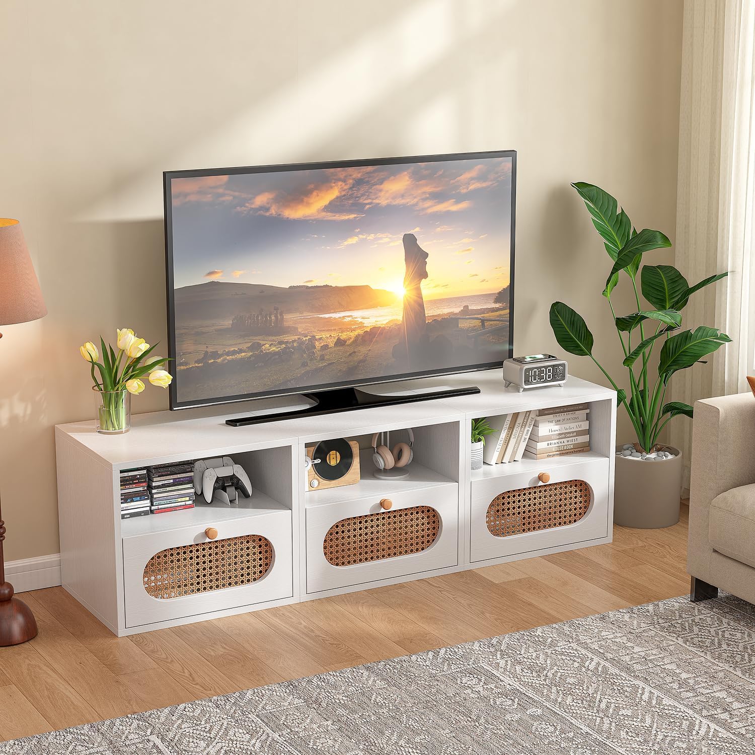 3-in-1 Modular TV Stand with Rattan Doors, DIY Media Console Boho Entertainment Center Modern TV Cabinet with Open Shelves,White