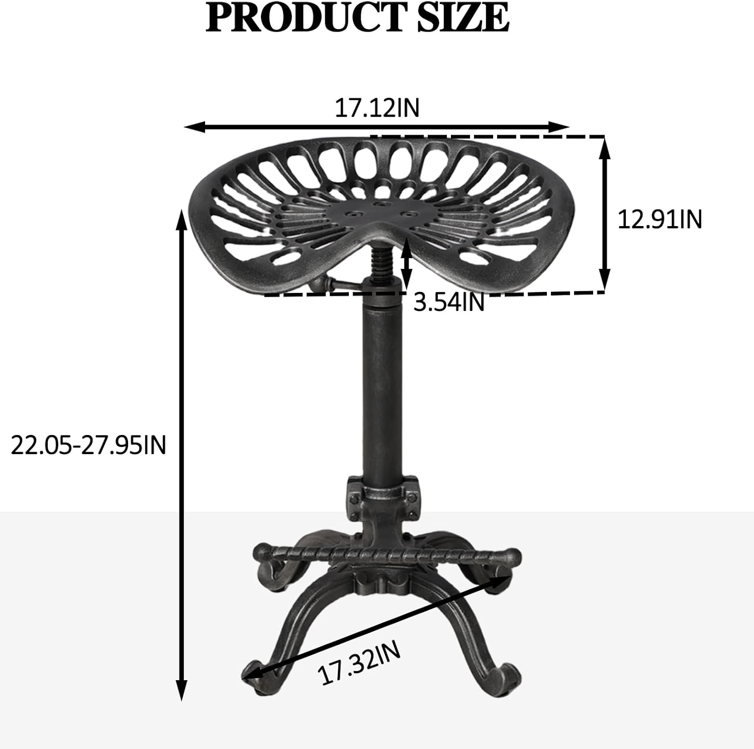 - Design. ①360 degree swivel seat②Tractor metal seat: hip-curve design ③Height adjustable: 20-27inch④ Backless and footrest ⑤Adjustable foot cap.