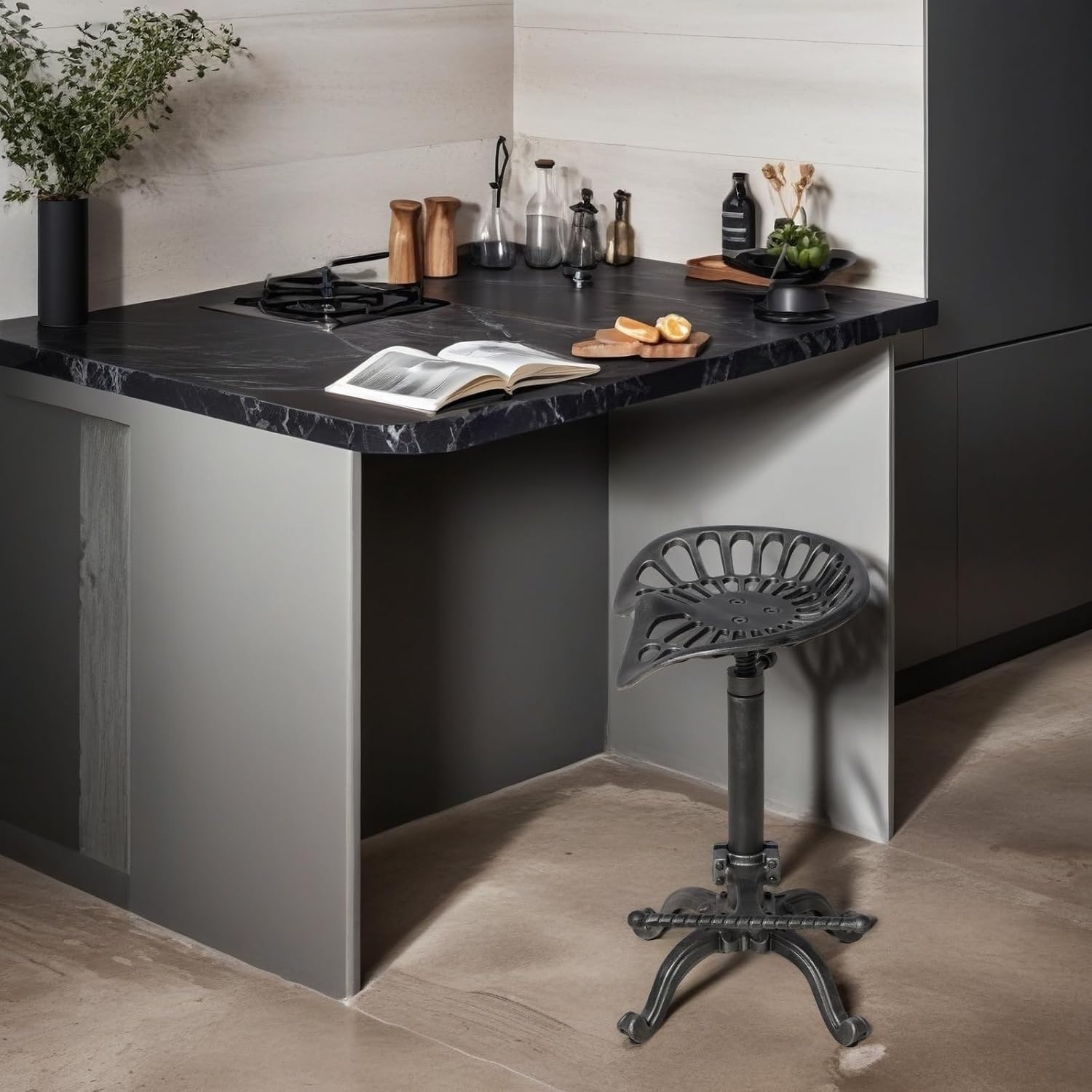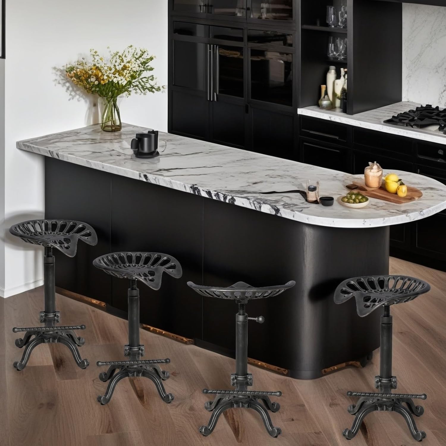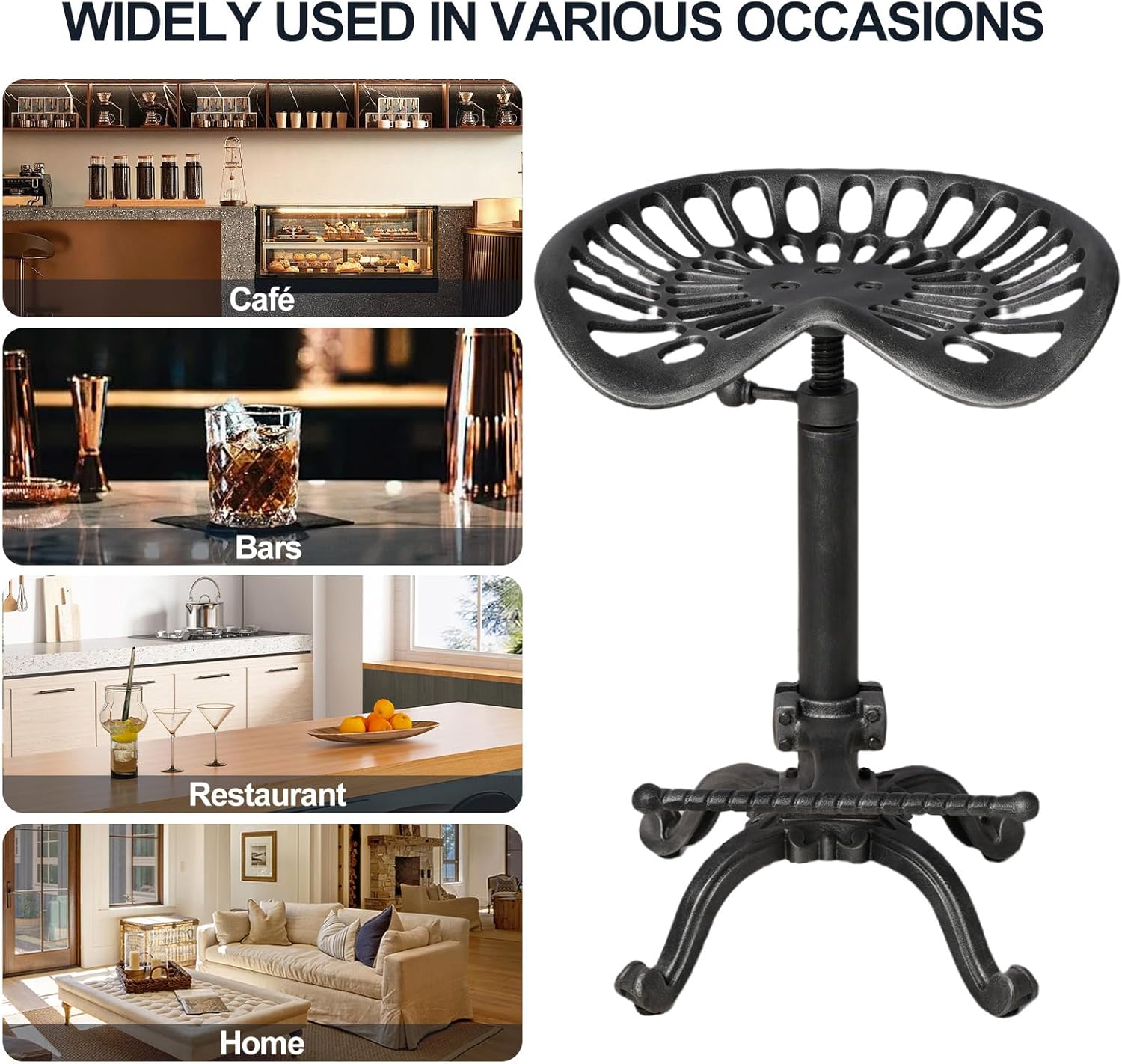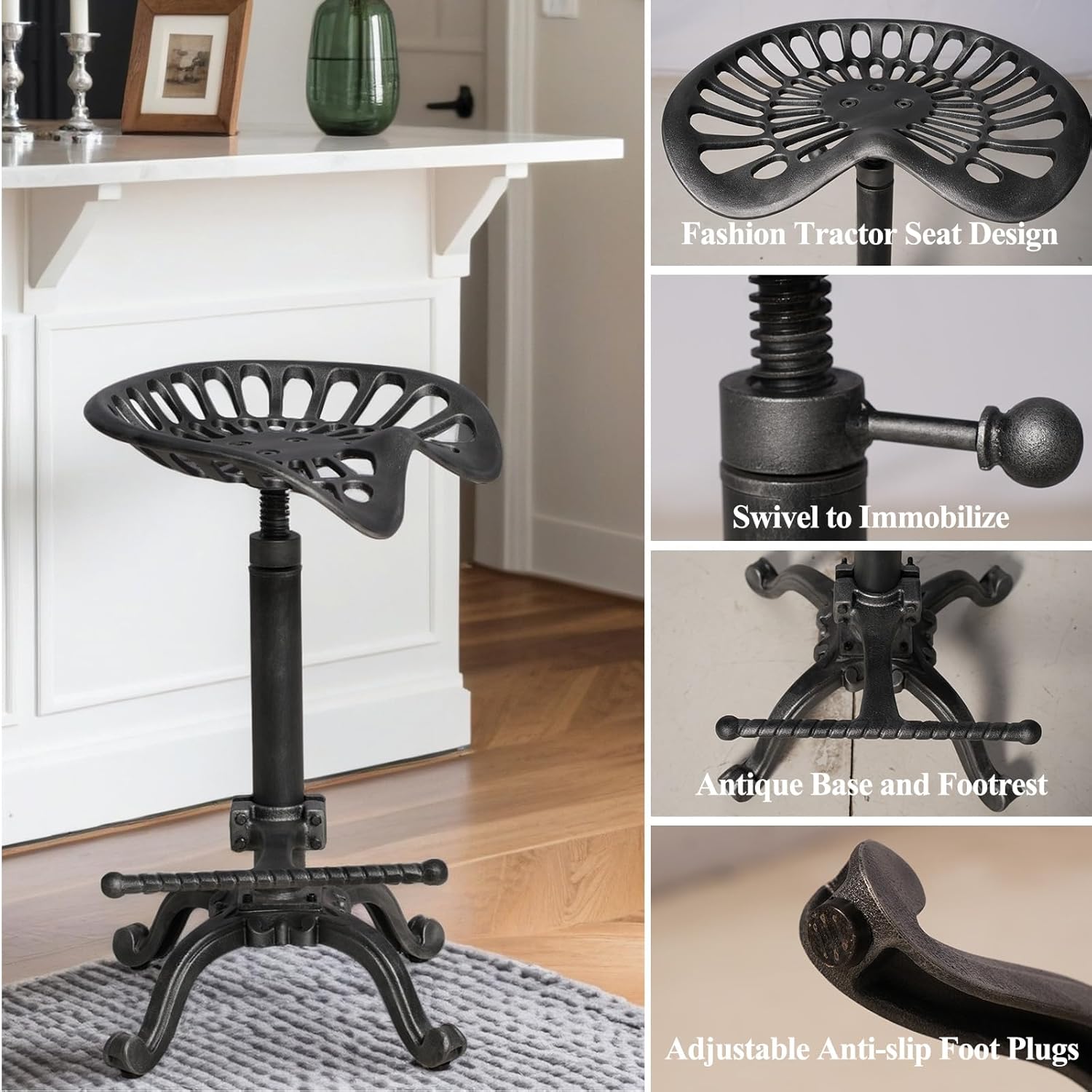 - Bar Height. 360 degree swivel from 20” up to 27” to meet your needs. Easily adjust stool height just by spin the seat to meet counter height& Pub height. No matter at your kitchen island or bar. They CAN swivel as long as you don’t tighten the handle super tight. This cast iron tractor bar stools is excellent choice.