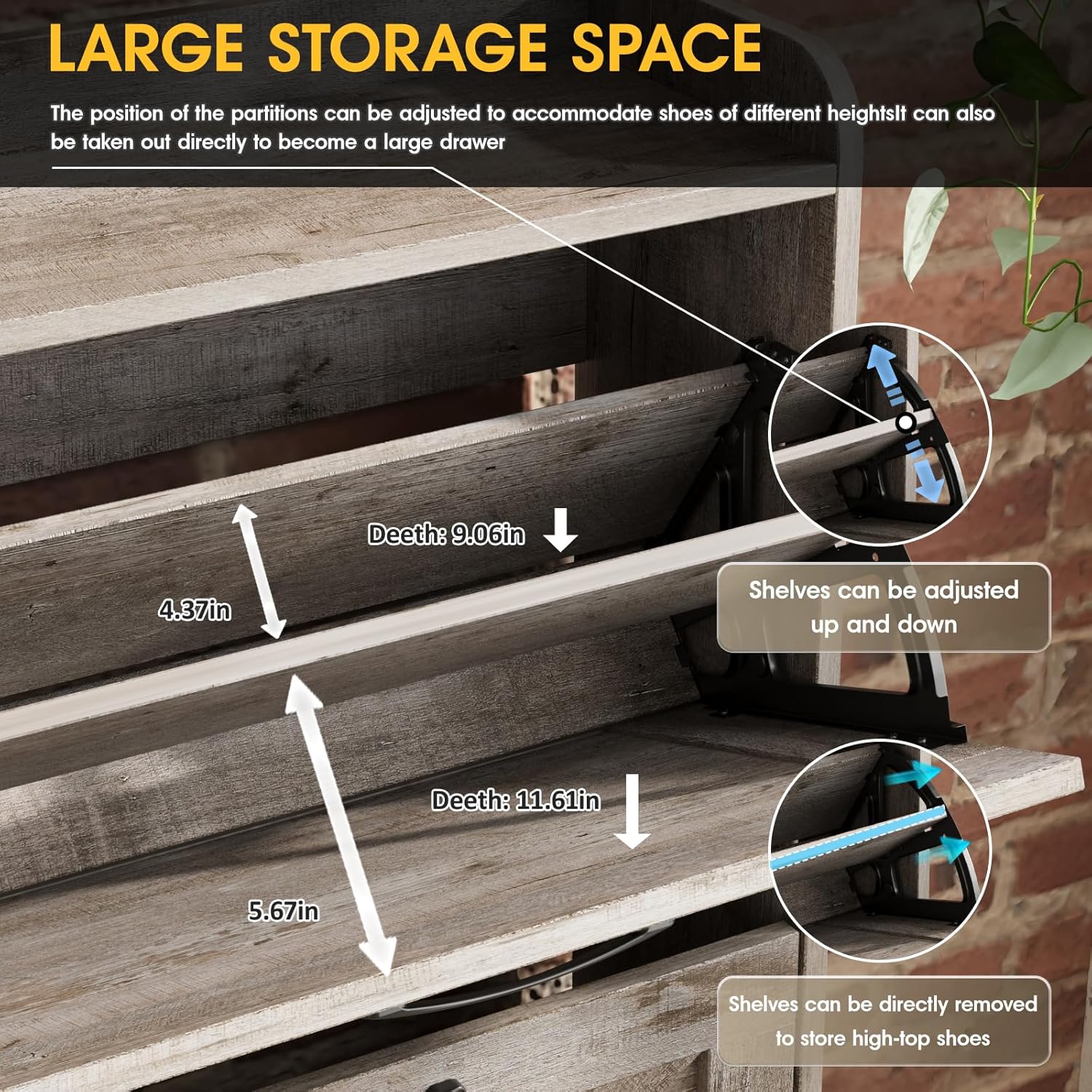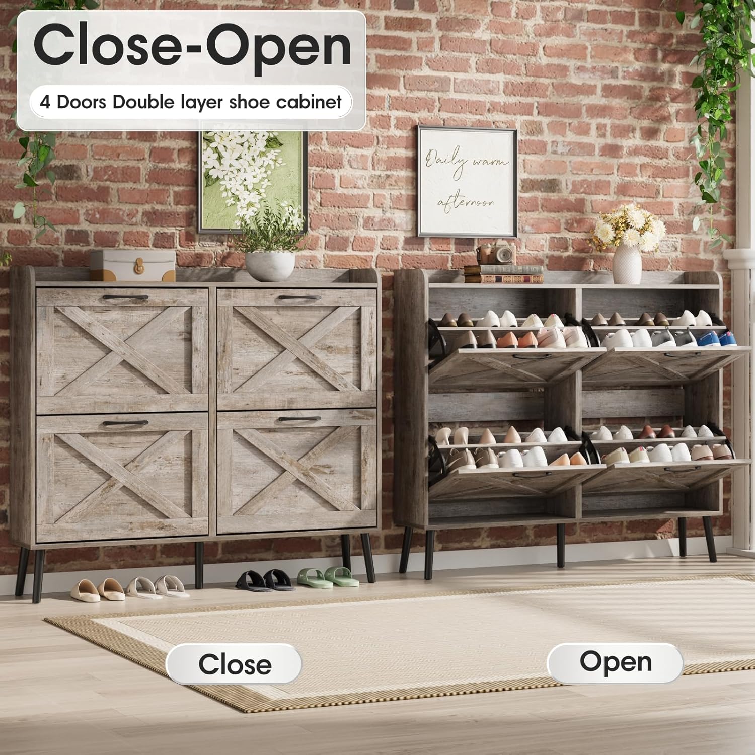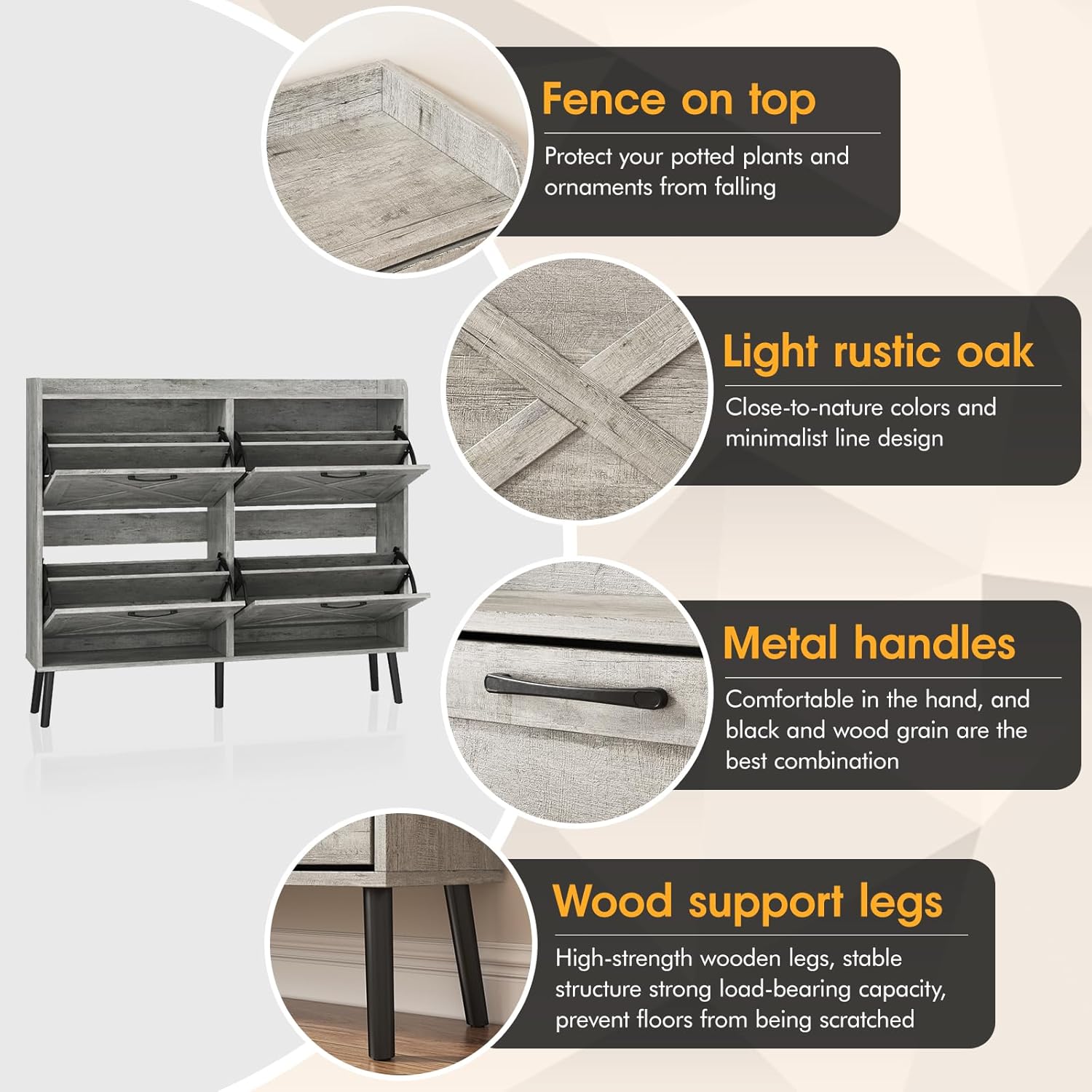 - Entryway Shoe Cabinet: The hidden shoe storage cabinet with 4 flip doors, stylish and simple light rustic oak makes it a neat and beautiful finish and looks great in many different home styles. Perfect for placing in the entryway, hallway, living room, or porch, provides a neat looking in your home and space saving
