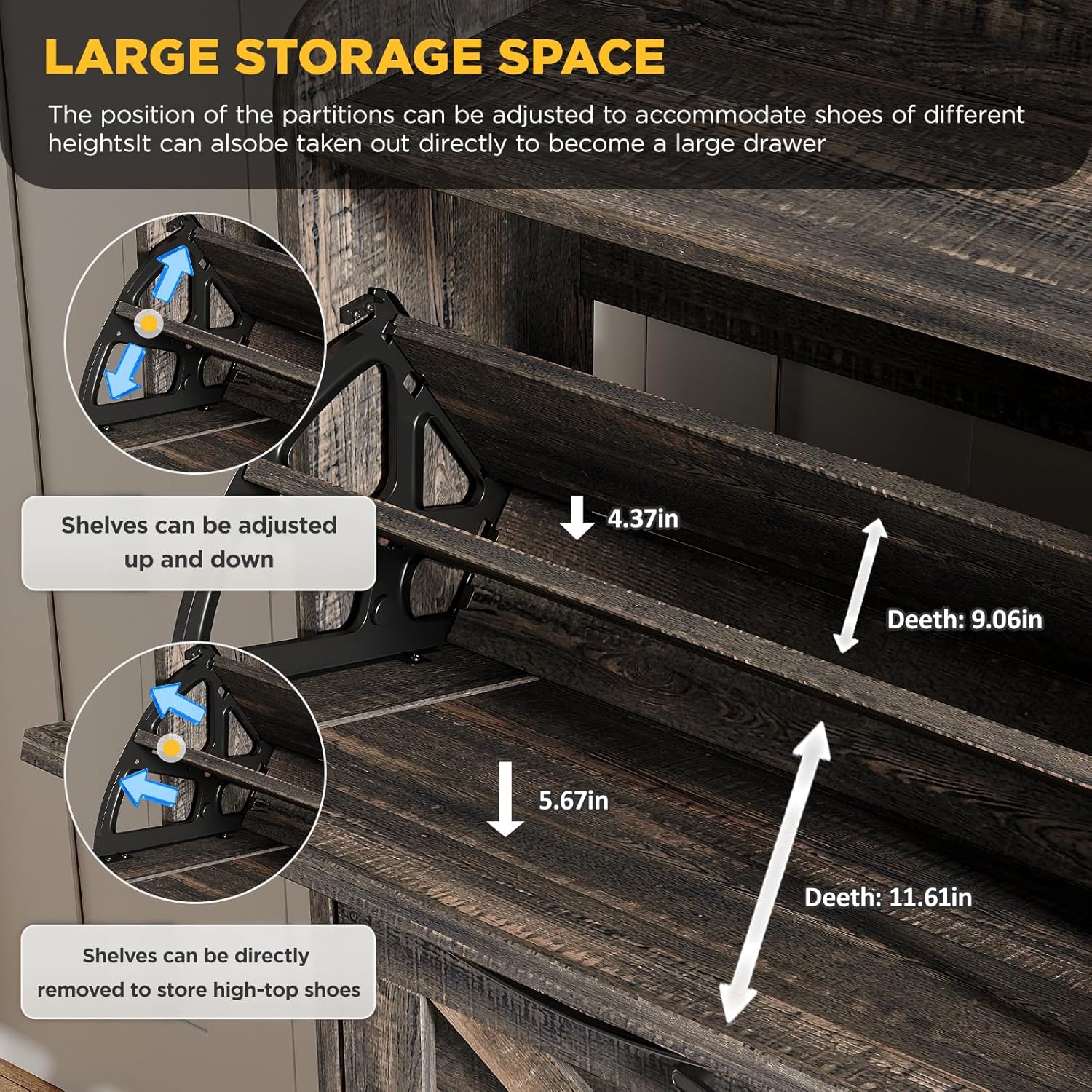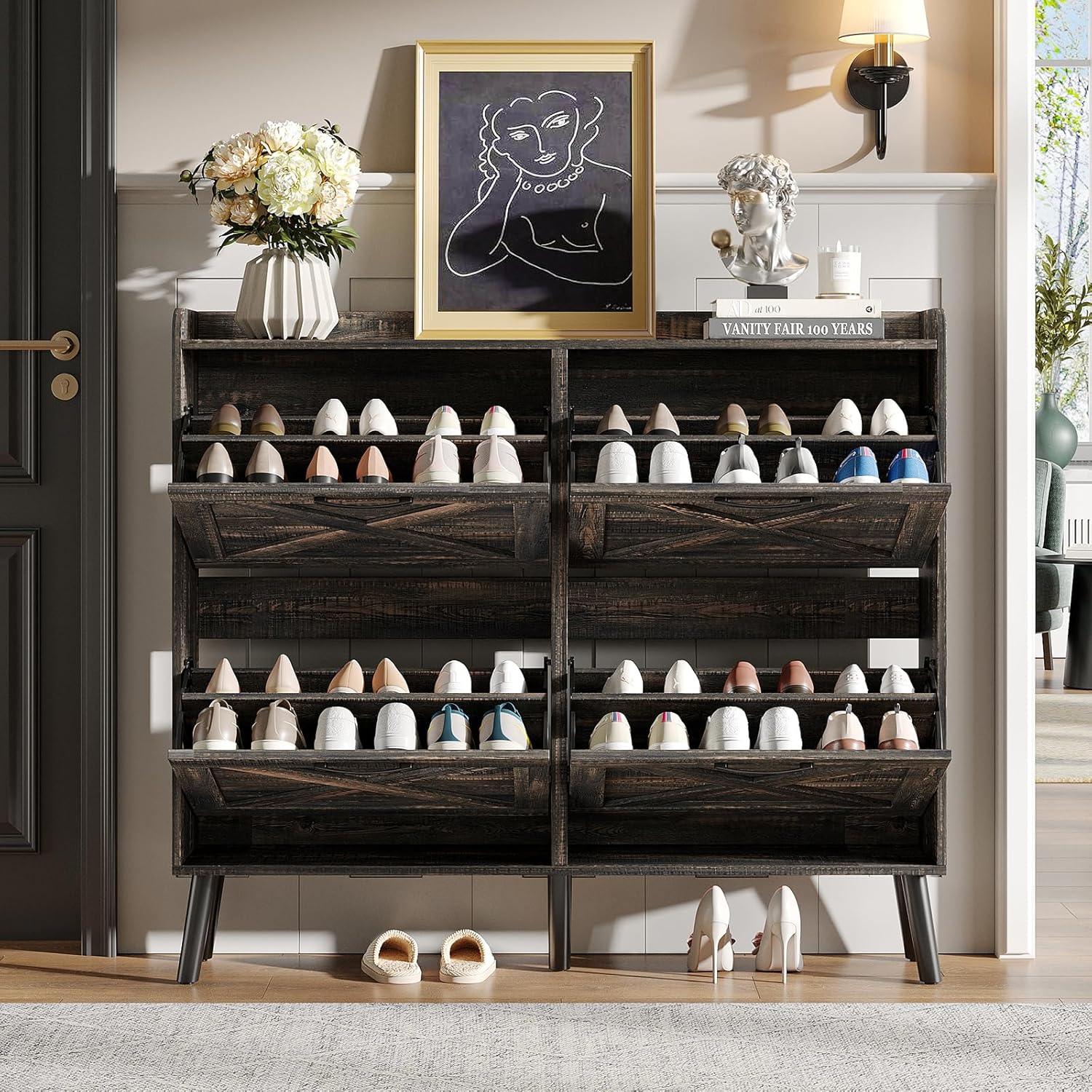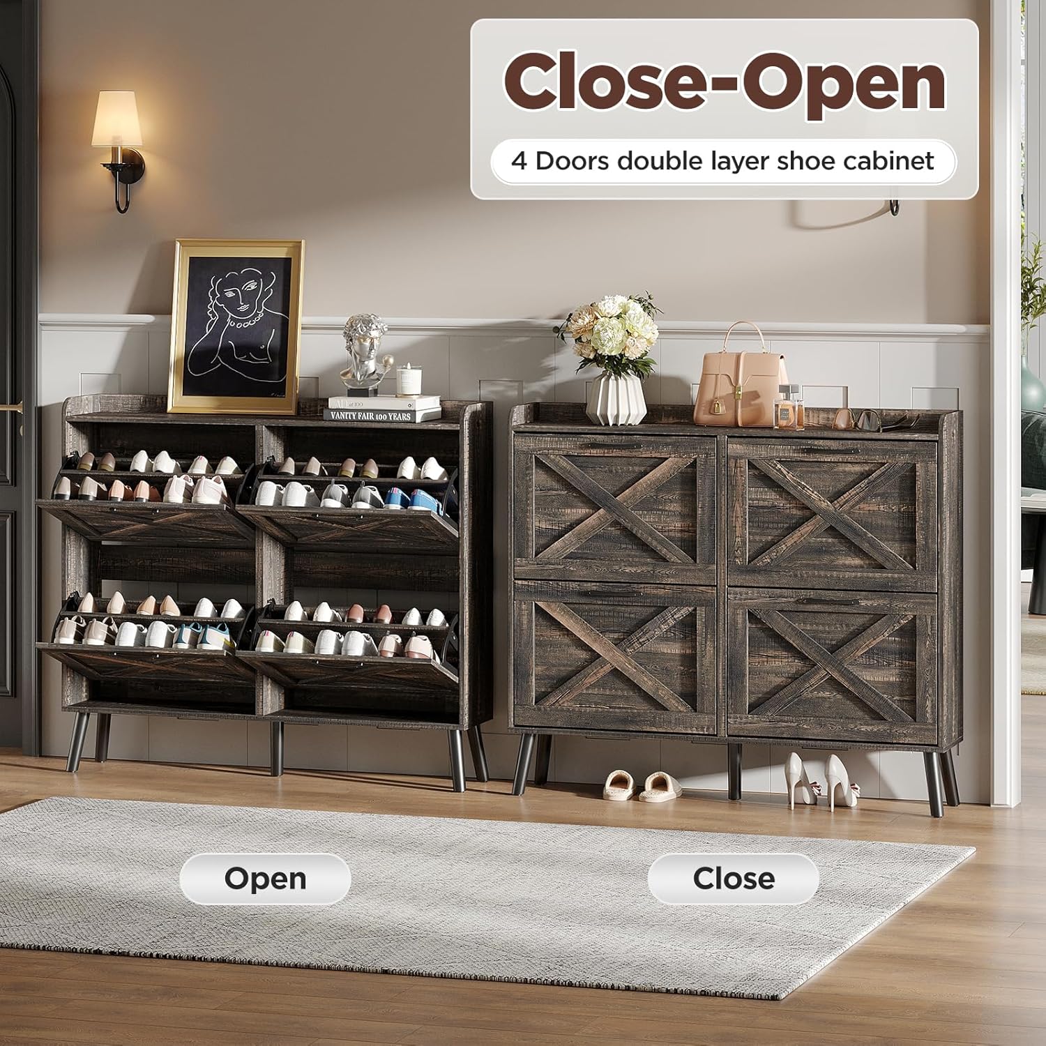 - Entryway Shoe Cabinet: The hidden shoe storage cabinet with 4 flip doors, stylish and simple dark rustic oak makes it a neat and beautiful finish and looks great in many different home styles. Perfect for placing in the entryway, hallway, living room, or porch, provides a neat looking in your home and space saving