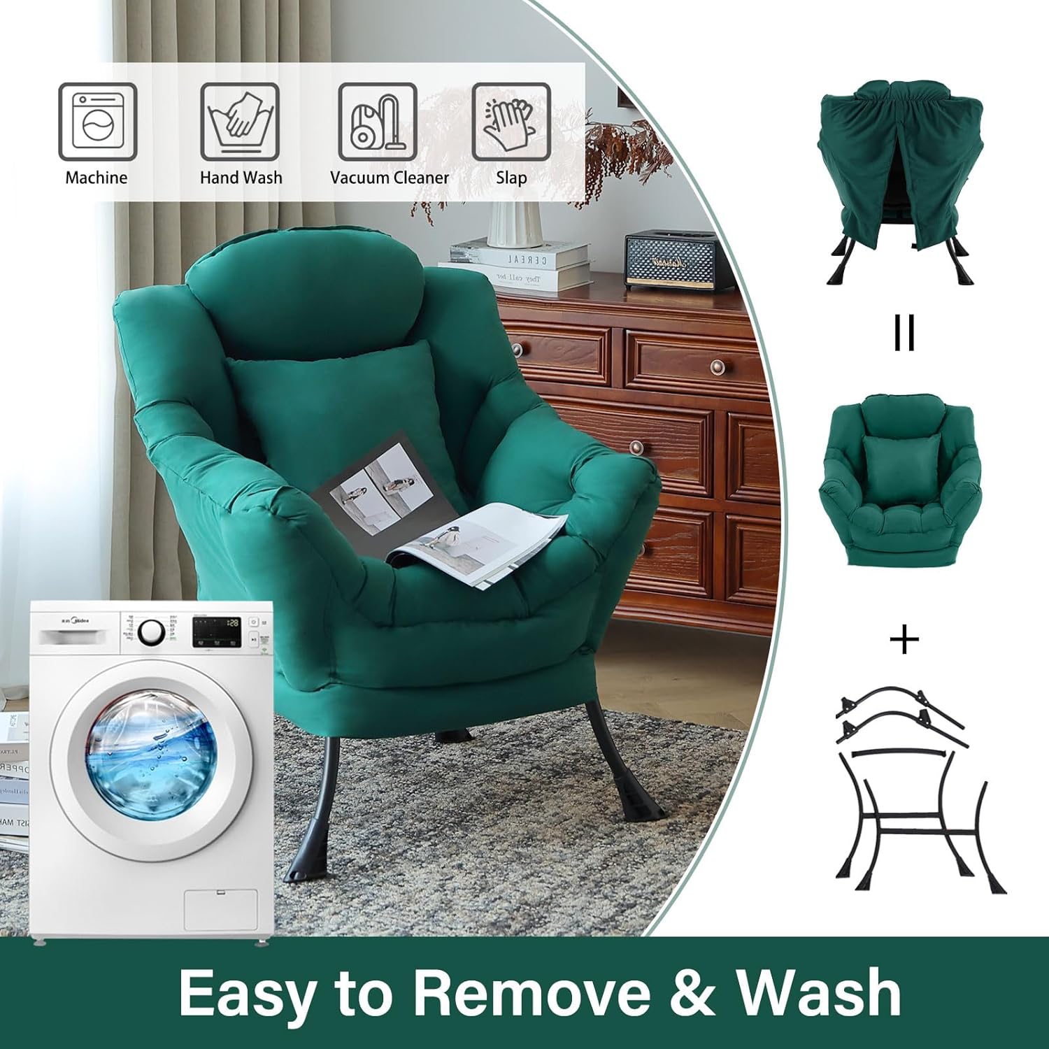 Lazy Chair with Pillow for Living Room, Modern Lounge Accent Chair with Armrests and a Throw Pillow, Leisure Sofa Chair Set, Reading Chair for Bedroom, Dorm Room, Office, Dark Green