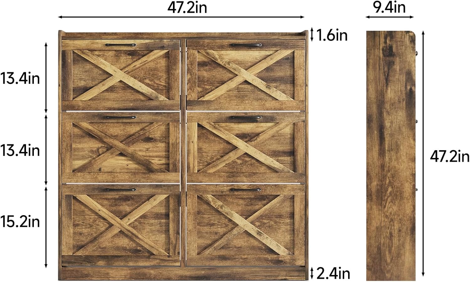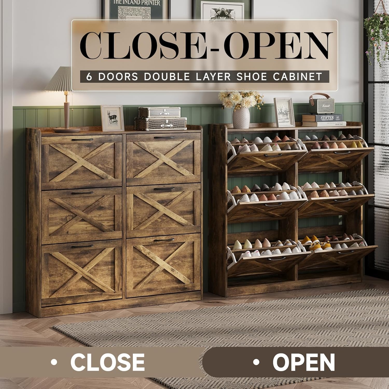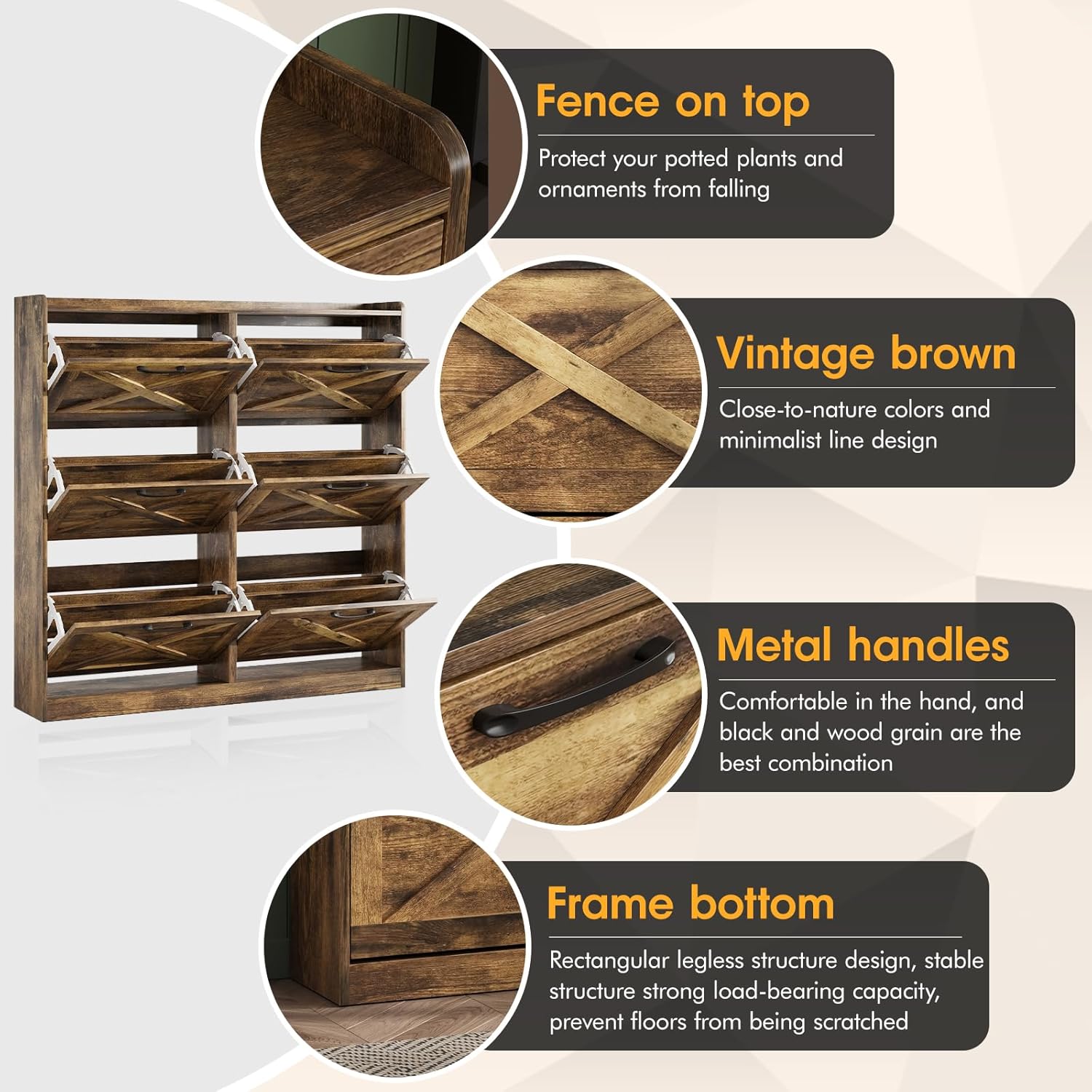 - Entryway Shoe Cabinet: The hidden shoe storage cabinet with 6 flip doors, stylish and simple rustic brown makes it a neat and beautiful finish and looks great in many different home styles. Perfect for placing in the entryway, hallway, living room, or porch, provides a neat looking in your home and space saving