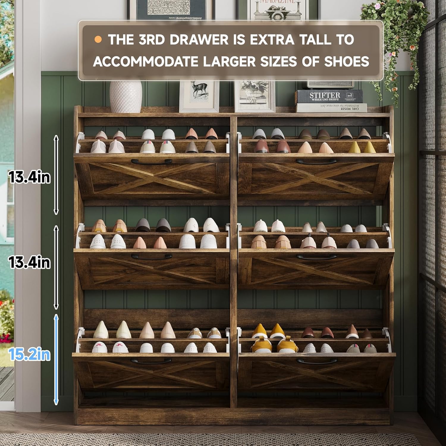 Maupvit Large Shoe Storage Cabinet with 6 Flip Drawers, Freestanding Shoe Organizer with Metal Handles for Entryway, Narrow Shoe Rack Cabinet, Rustic Brown